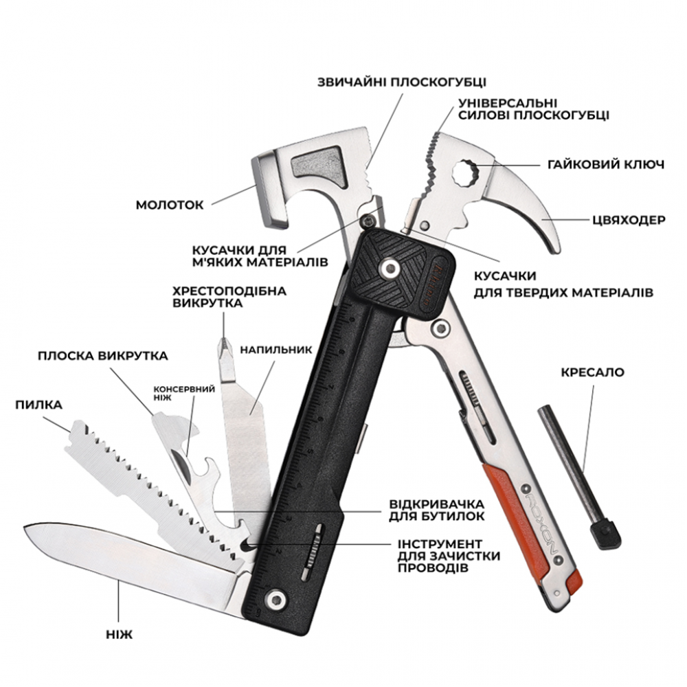 Мультитул H1 від Roxon — це перша функціональна модель бренду з основним інструментом у вигляді молотка. Аксесуар стане в пригоді у побуті; в ремонтних роботах в гаражі або в професійних цілях; коли є необхідність у великій кількості інструментів; але немає можливості носити з собою повноцінний набір із великою вагою.