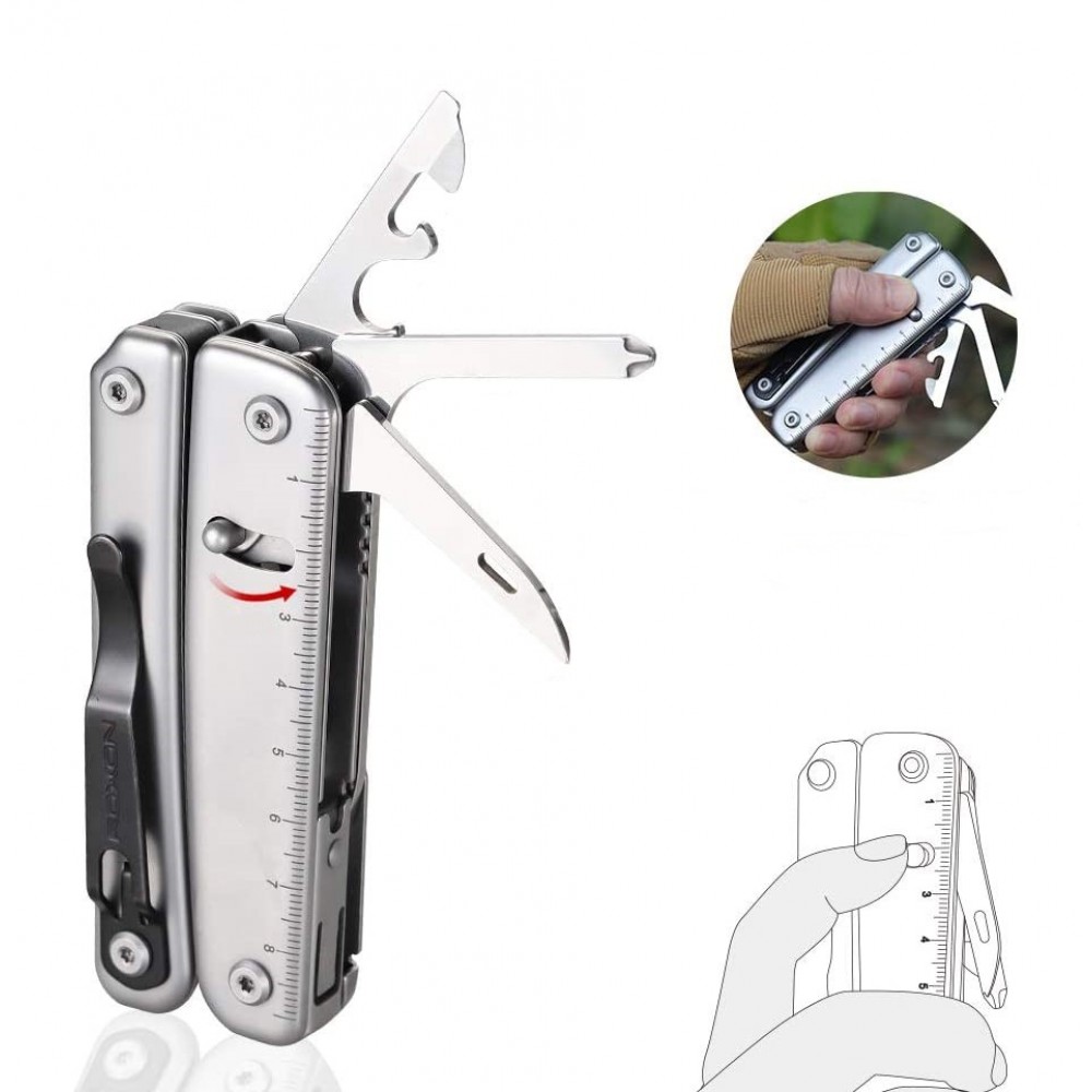 Керувати моделлю можна однією рукою, робити це легко і просто. Вам буде зручно і приємно працювати з мультиинструментом, навіть коли руки в рукавицях. Всі функції мультитула абсолютно ефективні. Ніж добре виконує такі види робіт, як стругання дерева, перерізання мотузки, а також інші дії. При виготовленні використовували сталь марки 5Cr15MoV, твердість якої оцінюється в 55-58 одиниць по Роквеллу. Сталь міцна, і гарантує гостру ріжучу кромку. Ніж безпечно використовувати. Він комфортний в роботі.