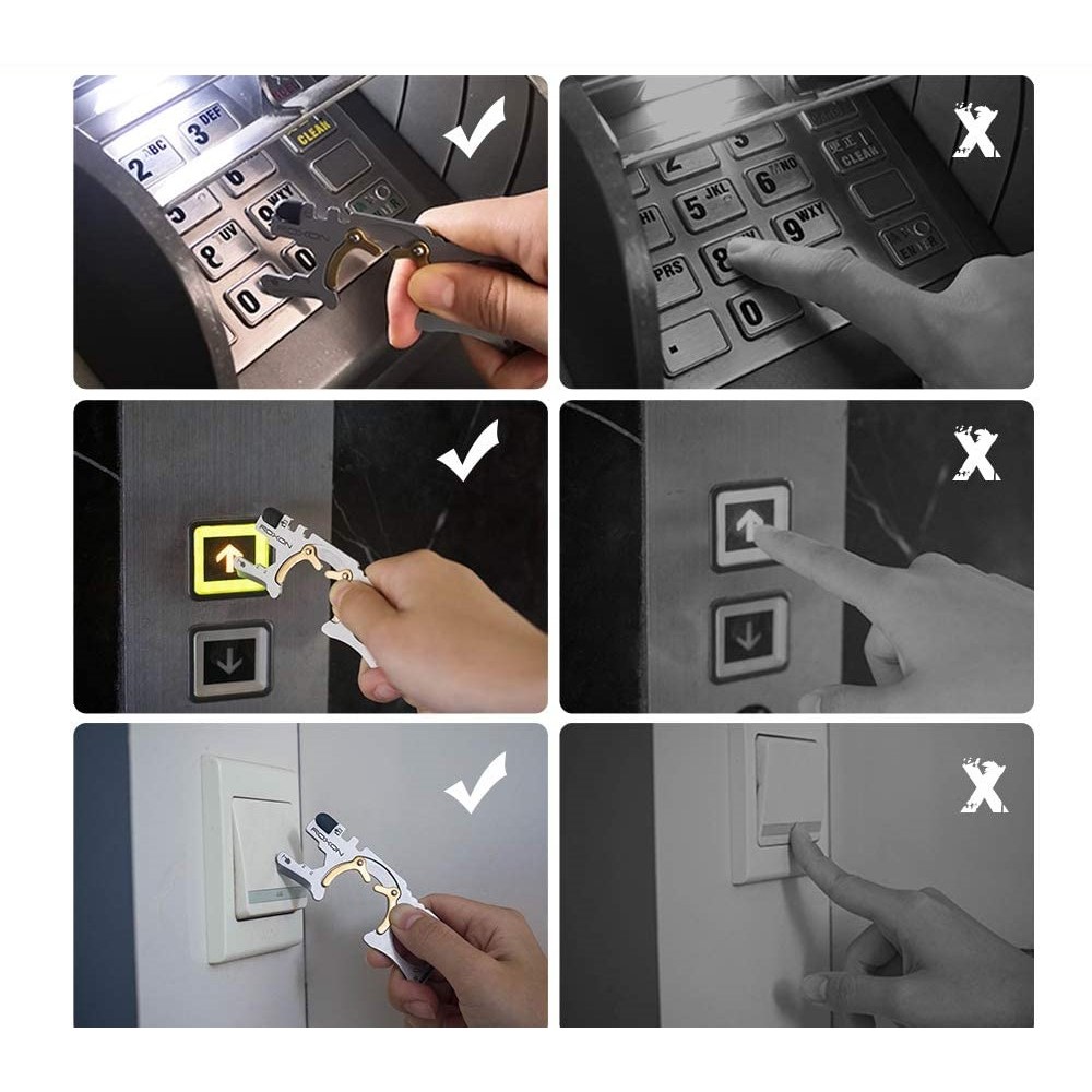 Дверний гачок виготовлений з натурального антибактеріального мідного матеріалу, дієвого проти бактерій і вірусів. Мультитул сприяє міцному захопленню та утриманню дверної ручки, без ковзання, забезпечуючи безпеку. Натисніть, щоб відкрити двері. Точно так само просто, не побоюючись бактерій, можна йти виносити сміття, йти в супермаркет і виконувати інші дії. Можна навіть натискати на кнопки ліфтів або користуватися банкоматом, – все це праці не складі. Словом, мульті інструмент Roxon Spirit S705 дозволяє легко виконувати всі ті, що ви зазвичай робите за допомогою пальців своїх рук. Альо при цьому – без ризику зараження.