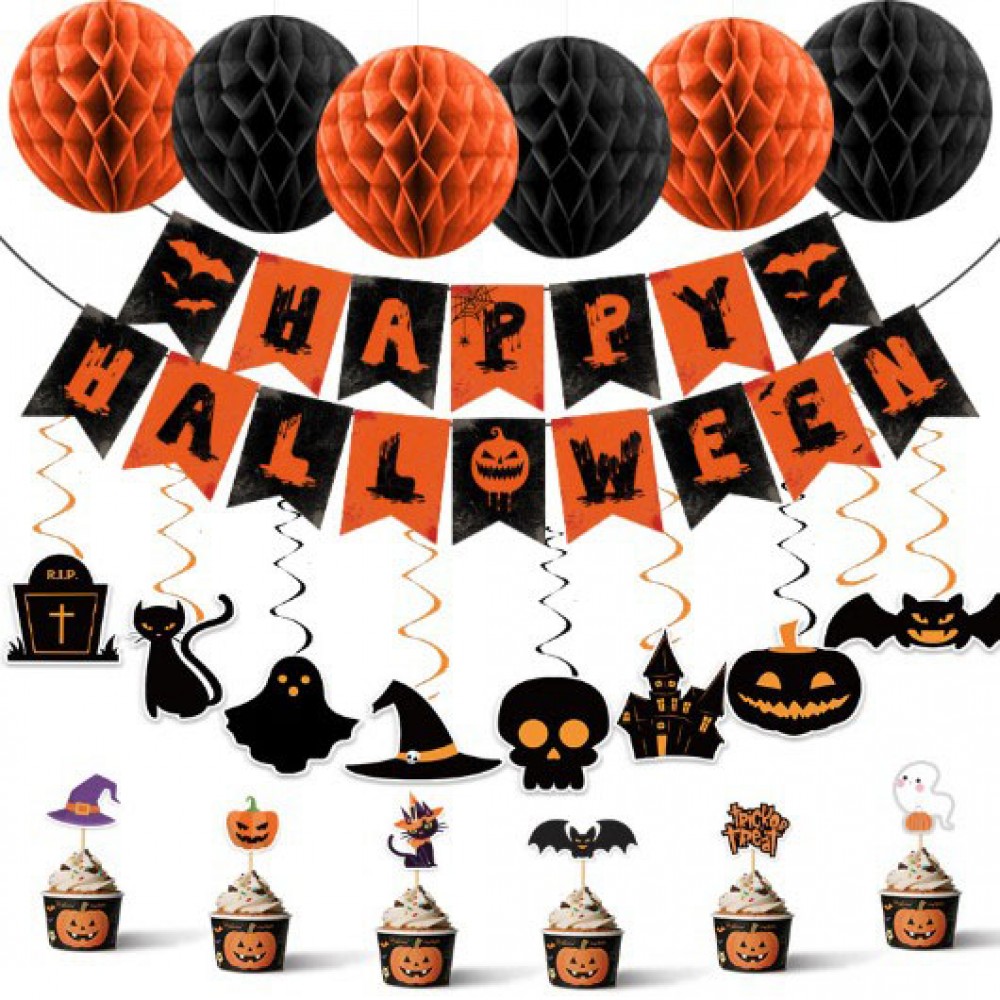 Набір декору Хелловін 48-в-1: банер, 6 «сот», 12 спіралей, 24 топери