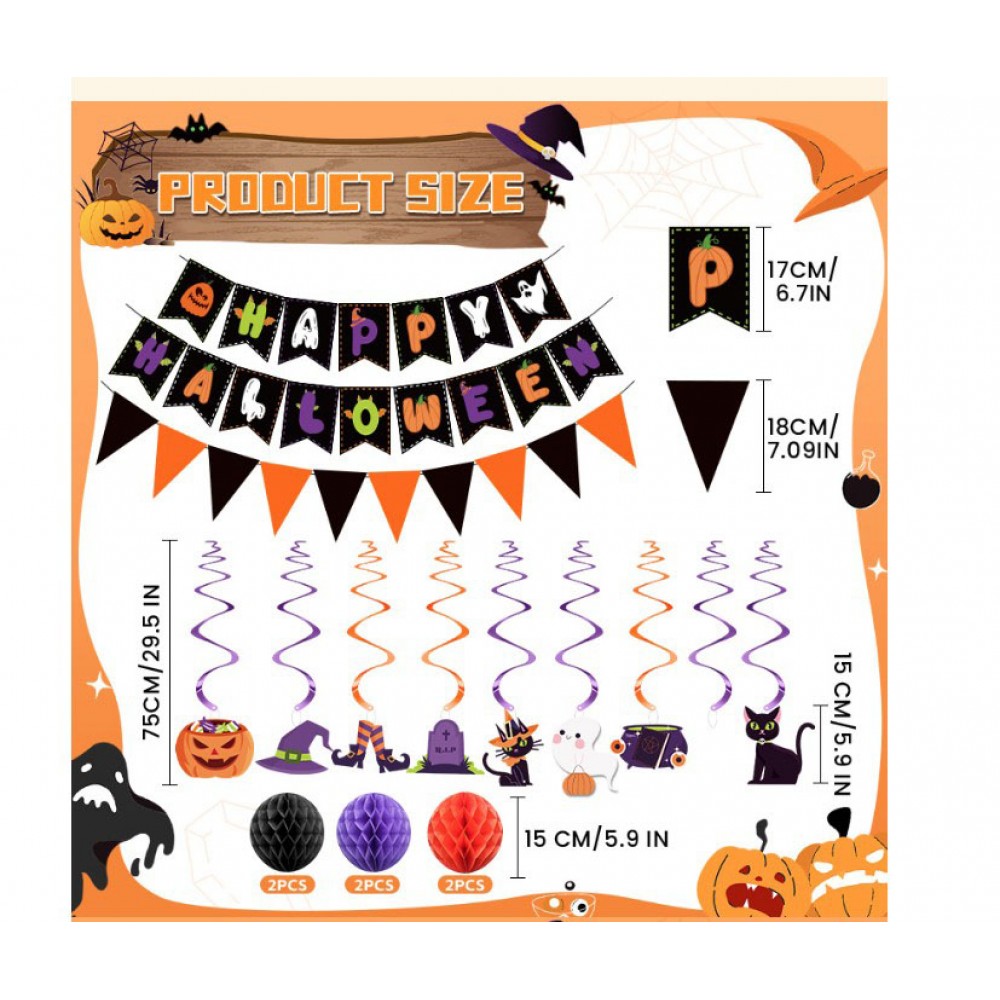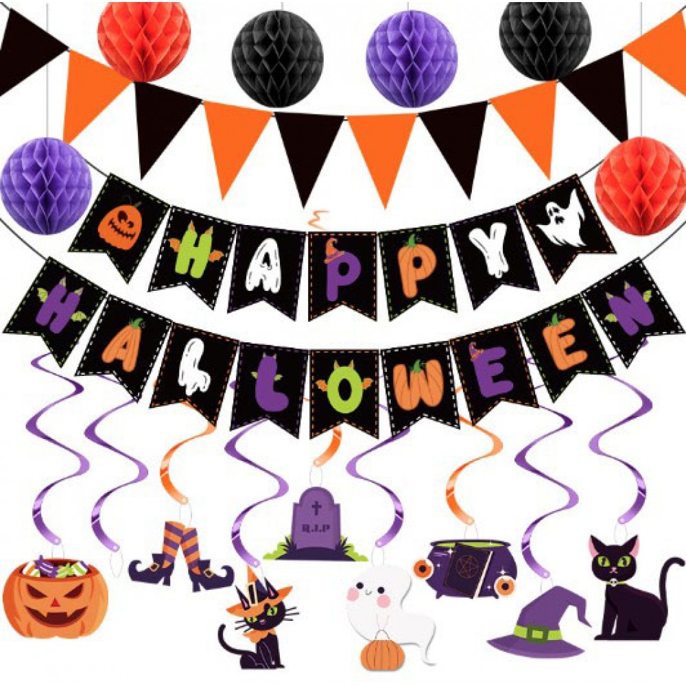 Набір декору на Хелловін: гірлянди + трикутні прапорці + паперові «соти» + підвісні спіралі