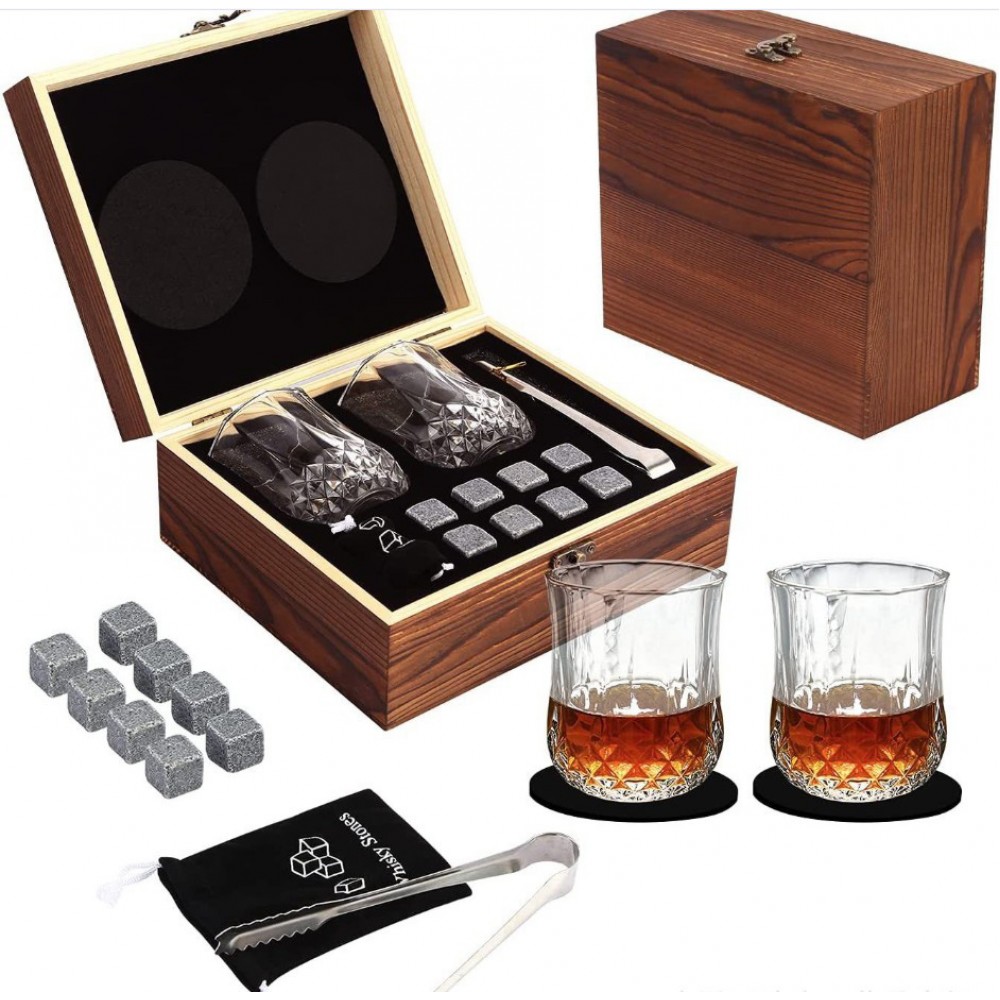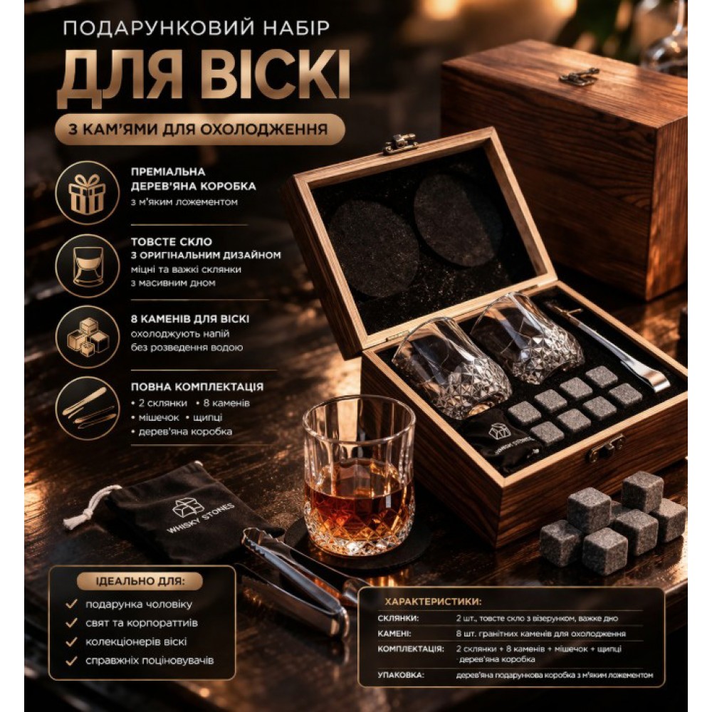 Заморозьте камені на 2-3 години, додайте 3-4 штуки в склянку і насолоджуйтеся ідеально охолодженим віскі, бурбоном або коктейлем. Темна дерев'яна коробка з металевим замком і чорним поролоновим вкладишем готова до вручення — додаткова упаковка не потрібна.
