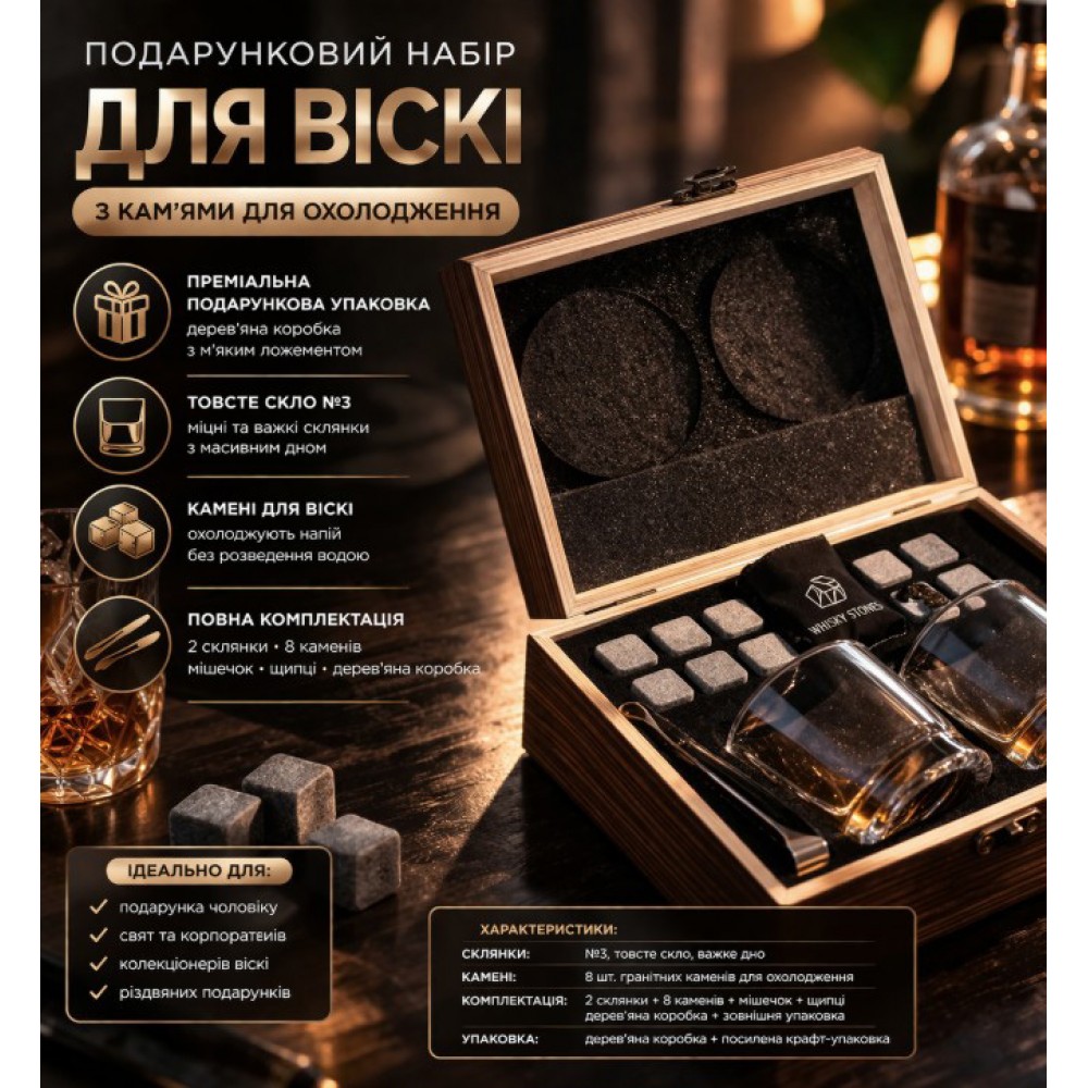 Подарунковий набір для віскі — все необхідне для справжнього поціновувача міцних напоїв в одній стильній дерев'яній коробці. Камені з натурального сланцю охолоджують напій без розбавлення, зберігаючи його смак і аромат недоторканими.