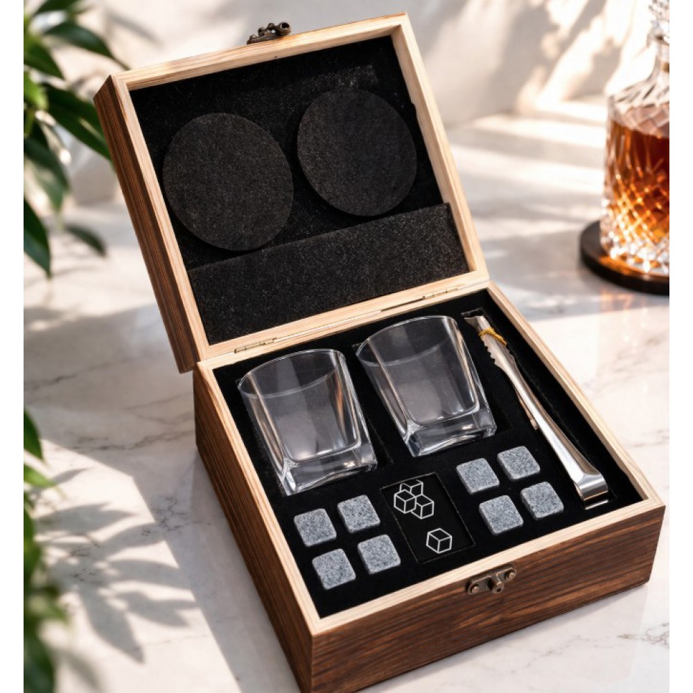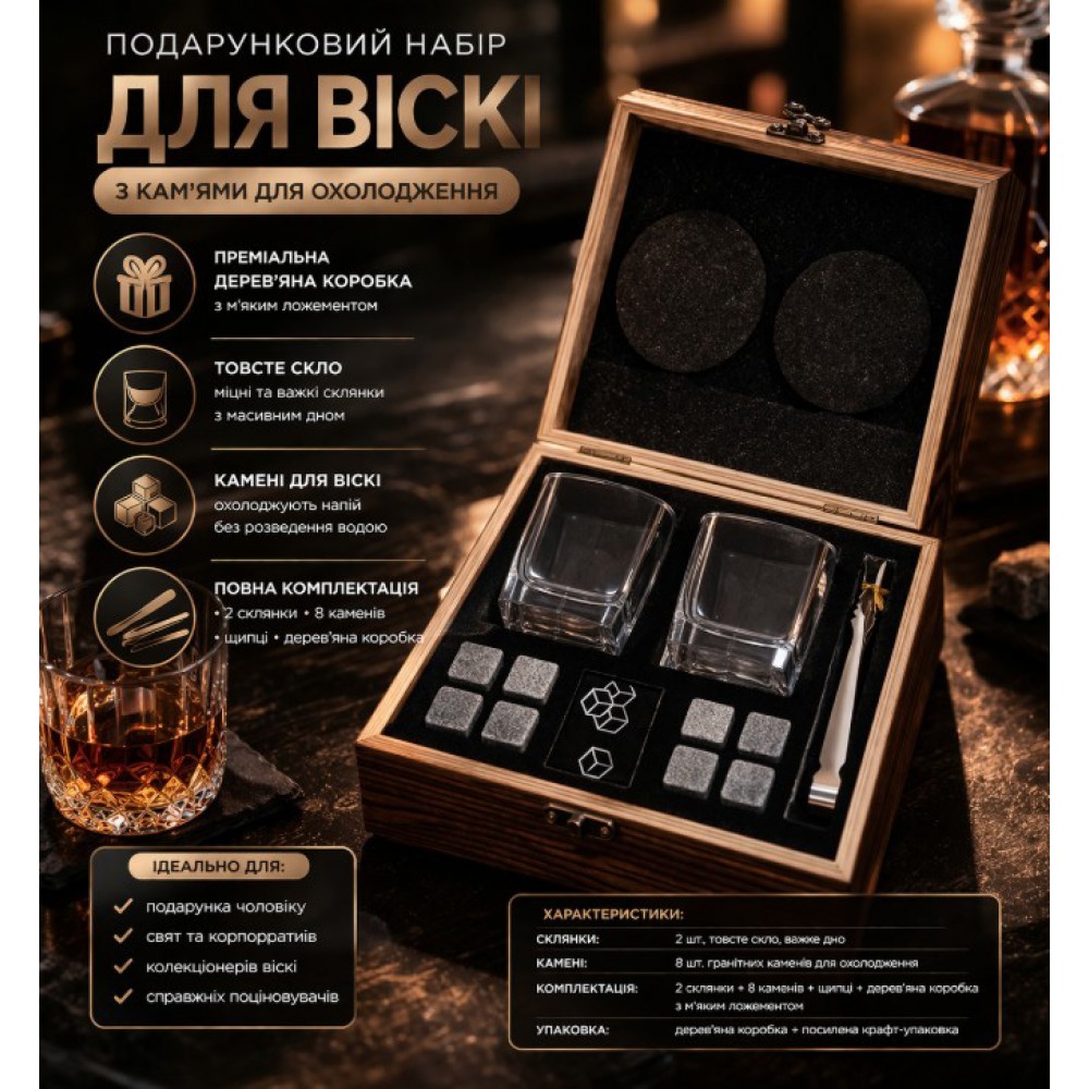 Камені з натурального сланцю охолоджують напій без розбавлення — смак і аромат віскі залишаються недоторканими. Заморозьте камені на 2-3 години, додайте 3-4 штуки в склянку — і насолоджуйтеся. Світла дерев'яна коробка з чорним поролоновим вкладишем виглядає як преміальний подарунок без додаткової упаковки.