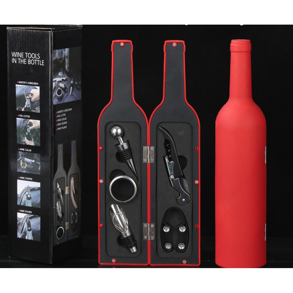 Оригінальний набір для вина в яскравому червоному футлярі у формі пляшки — виглядає незвично і відразу привертає увагу. Всередині зібрані найнеобхідніші аксесуари для відкриття та подачі вина, тому такий набір підійде і для дому, і як невеликий подарунок. Виглядає акуратно, зберігати зручно, на столі або в барі виглядає цікаво.