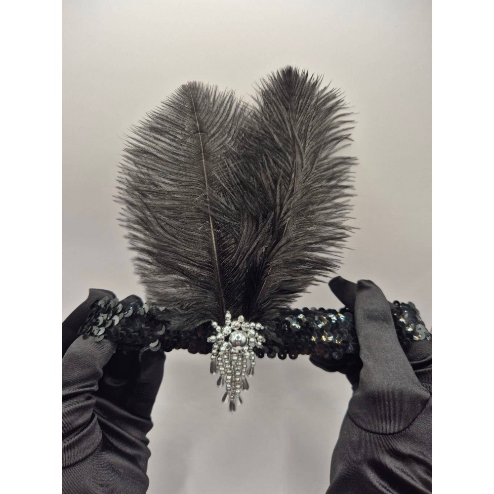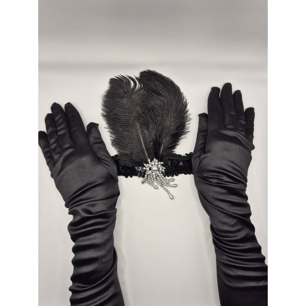 Ефектний набір у стилі 20-х, який одразу збирає образ “Gatsby / flapper” без зайвих пошуків. Пов’язка з чорним пір’ям, паєтками та сяючою брошкою додає “вау”-акцент на фото, а довгі чорні рукавички роблять образ більш елегантним і завершеним. Підійде для тематичної вечірки, фотосесії, карнавалу, корпоративу або виступу.