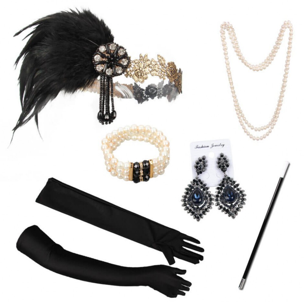 Это готовое решение для образа в стиле 20-х: не нужно подбирать серьги, перчатки и украшения отдельно — всё уже собрано в одном комплекте.