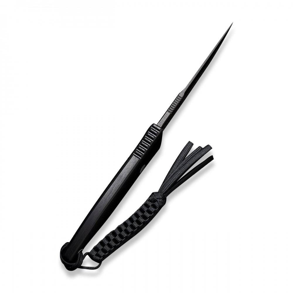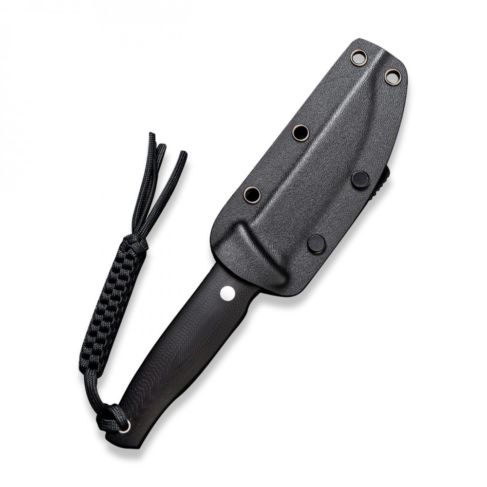 Ручка з розширенням в основі, створюються двосторонні упори для пальців. Для гарного хвату з нижньої сторони знаходиться плавна виїмка для пальця, з верхнього – протиковзні випили. Накладки, виготовлені з композитного матеріалу G-10, формують цільну ручку. Фіксація накладок - сталеві елементи, додатково є втулка, що служить отвором для шнурка.