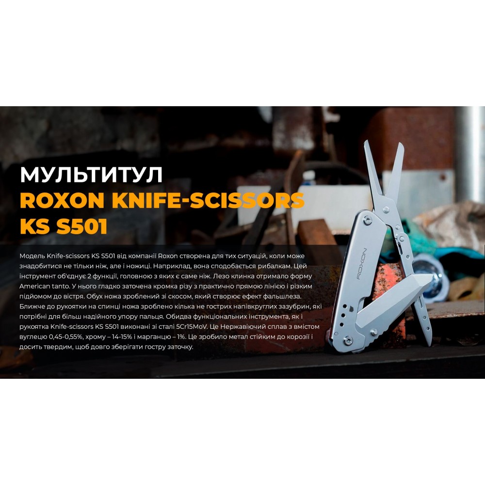 Модель Knife-scissors KS S501 від компанії Roxon створена для тих ситуацій, коли може знадобитися не тільки ніж, але і ножиці. Наприклад, вона сподобається рибалкам. Цей інструмент поєднує 2 функції, головним з яких є саме ножа.