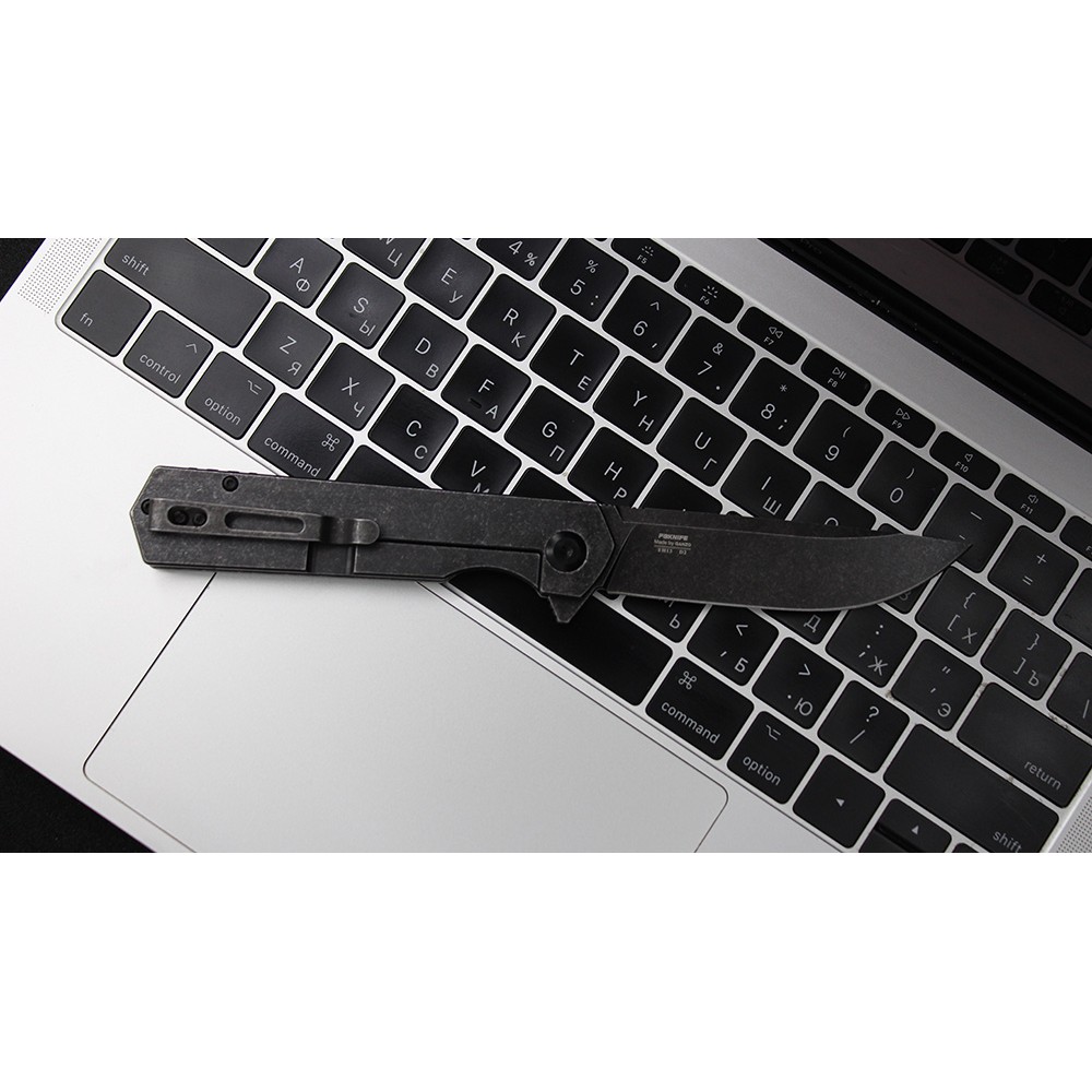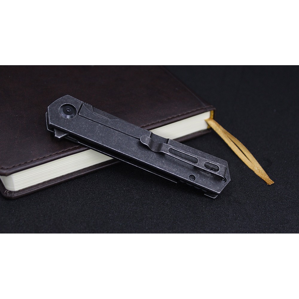 Для рукоятки виробники також вирішили використовувати метал. Проте для цієї деталі була обрана більш стійка до впливу води нержавіюча сталь. Форма ручки дуже проста, без будь-яких надмірностей у дизайні. Але оригінальність їй забезпечує така ж фінішна обробка, як і у леза ножа. А для зручності користувачів, до рукоятки прикручена невелика сталева кліпса, що дозволяє зафіксувати інструмент в кишені або на поясі.