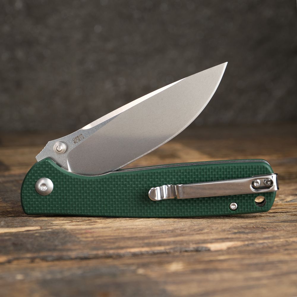 Виробник потурбувався про ергономіку ножа і доповнив його рукоять склотекстолітовими (G10) накладками сірого кольору. Вони кріпляться на конструкції за допомогою пари гвинтів і мають шорстку поверхню, щоб модель не вислизала з руки під час використання. Довжина рукояті становить 112 міліметрів і підходить власникам долоні будь-якого розміру.