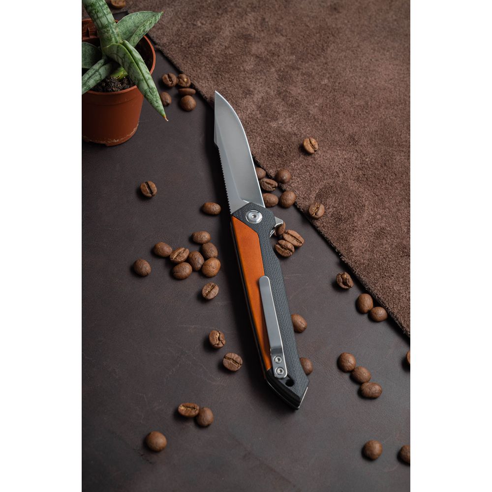 Рукоять ножа виготовлена з використанням склотекстоліти G10. Даний матеріал є дуже стійким до механічних впливів, ефективно протистоїть згубному впливу вологи. Він також добре піддається фарбуванню. Міцний, здатний витримувати вплив високих температур. Також до складу рукояті увійшла шкіра – легка, преміум-класу. Відкривається і закривається безпечно однією рукою. Керамічний підшипник забезпечує плавне відкриття і закриття леза. Ножовий механізм-фліппер.
