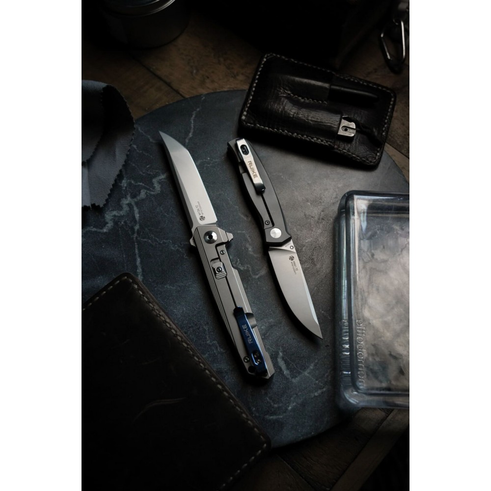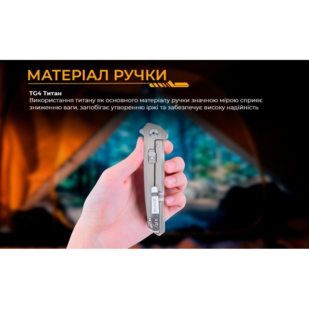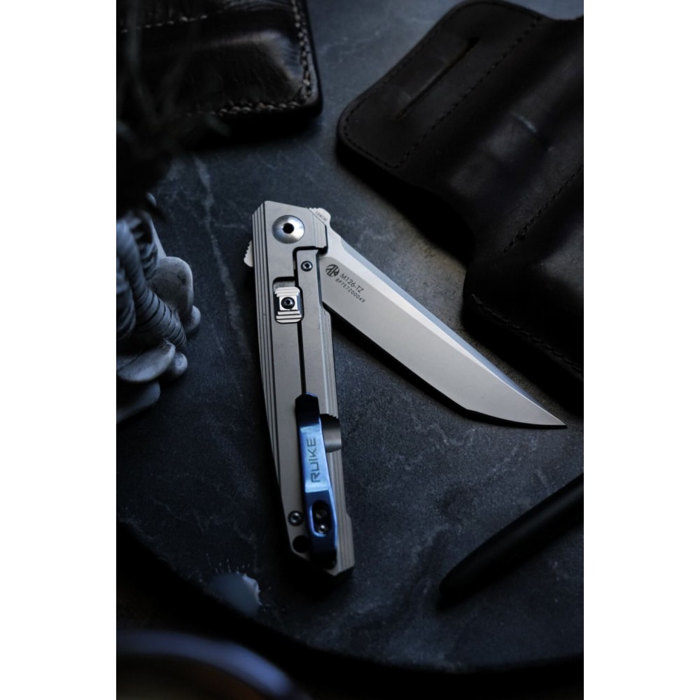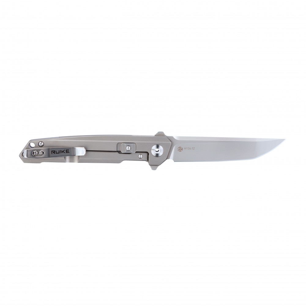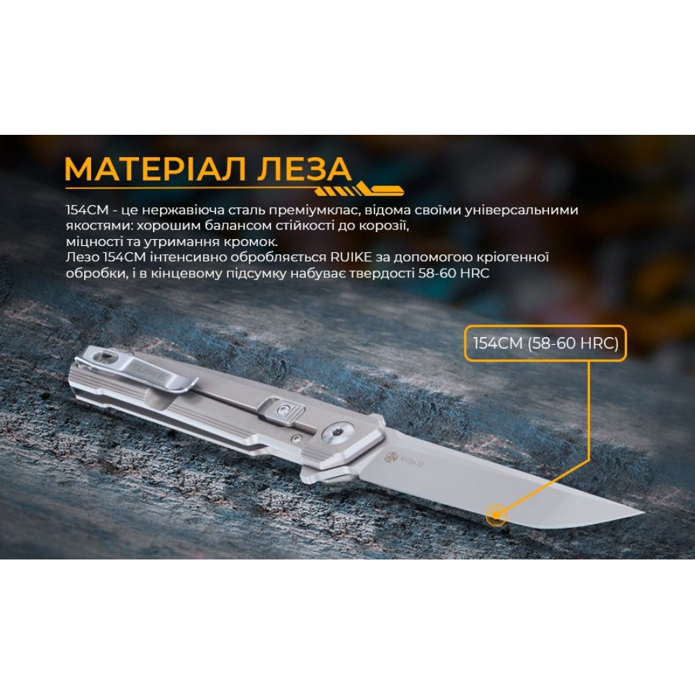 Клинок Ruike M126-TZ має довжину 91 мм і товщину 3.1 мм, тому може застосовуватися не тільки в силових роботах, а й у ситуаціях, де необхідний ідеально рівний та точний різ. Сталь клинка — американська марка 154СМ, яка належить до преміальних матеріалів завдяки високій корозійній стійкості та тривалому збереженню гостроти леза. Обробка сталі за технологією Bead Blast робить поверхню матовою, приховуючи дрібні подряпини, що виникають під час експлуатації. Клинок має пряме заточування і є простим у догляді — для заточування та правки леза можна використовувати абразиви середньої або дрібної зернистості.
