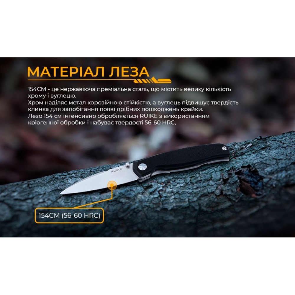 Для надання клинку високої міцності та довговічності, у його виробництві використовується сталь 154СМ. Вона є преміальною маркою, що містить велику кількість хрому (±14%) і вуглецю (1.1%). Хром наділяє метал корозійною стійкістю, а вуглець підвищує твердість клинка для запобігання появі дрібних пошкоджень крайки.