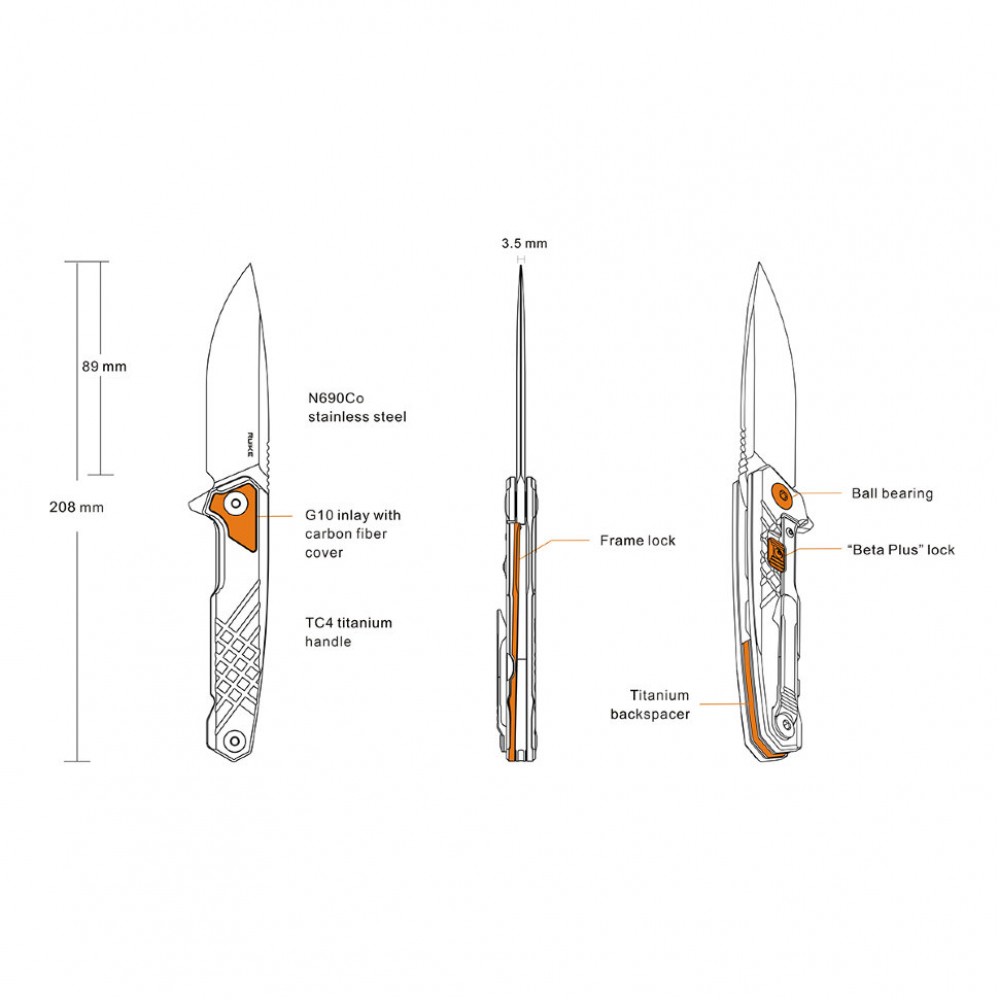 Клинок витягується за допомогою натискання на односторонню «гарду». Фіксація здійснюється за допомогою замка Frame lock. Є фірмовий запобіжник Beta Plus. Знімний наконечник із сталі запобігає стиранню, деформацію, а також заїдання під час контакту двох металів. Титанова рукоятка ножика має декоративні вставки з композитного матеріалу G-10. Лицьовий шар складається з вуглеволокна. Ергономічна форма рукоятки забезпечує комфорт при захопленні і утриманні інструменту. Для зручного перенесення моделі в кишені і на екіпіровці передбачена збоку кліпса зі спеціальним отвором. Отвір можна використовувати під різні шнурки і мотузки.