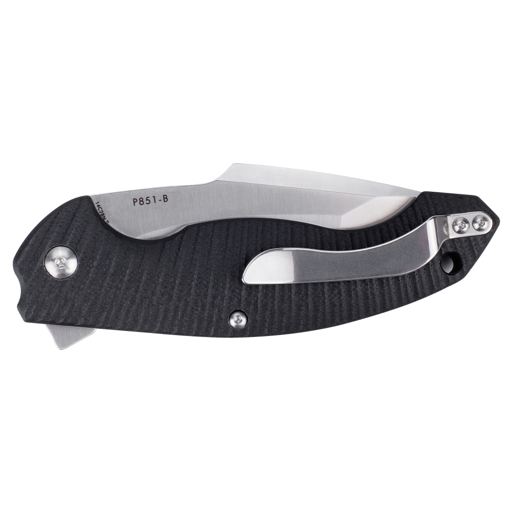 Нещодавно світ побачив ще один продукт компанії – ніж P851-B. Це складна модель, з рельєфною рукояттю темно-сірого кольору. Повна довжина моделі складає 20,6 сантиметри. Довжина леза – 8,9 см, товщина – 3,5 міліметра. Ніж важить 160 грам. Відмітна особливість новинки полягає у формі клинка «танто». Лезо подібного типу однаково добре справляється з проколюванням і нарізанням. Модель має зручну рукоятку зігнутої форми, адаптовану під часте використання. Утримувати ніж досить комфортно. Виріб забезпечений надійним замком типу Liner lock, за рахунок якого використовувати його максимально безпечно. Модель захищена від випадкового відкриття або закриття.