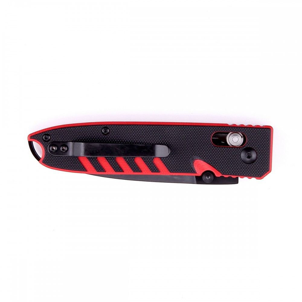 Для рукоятки виготовлені дві накладки з G10. Це сучасний різновид пластику, отримана в результаті з'єднання скловолокна і епоксидних смол. Матеріал дуже міцний і стійкий до більшості негативних факторів. До того ж, склопластик не складно пофарбувати. Тому покупцям пропонується ножа з рукояткою, в якій скомбіновані елементи червоного і чорного кольору. Також, до рукоятки прикручена кліпса, щоб фіксувати ніж у кишені або на ремені.
