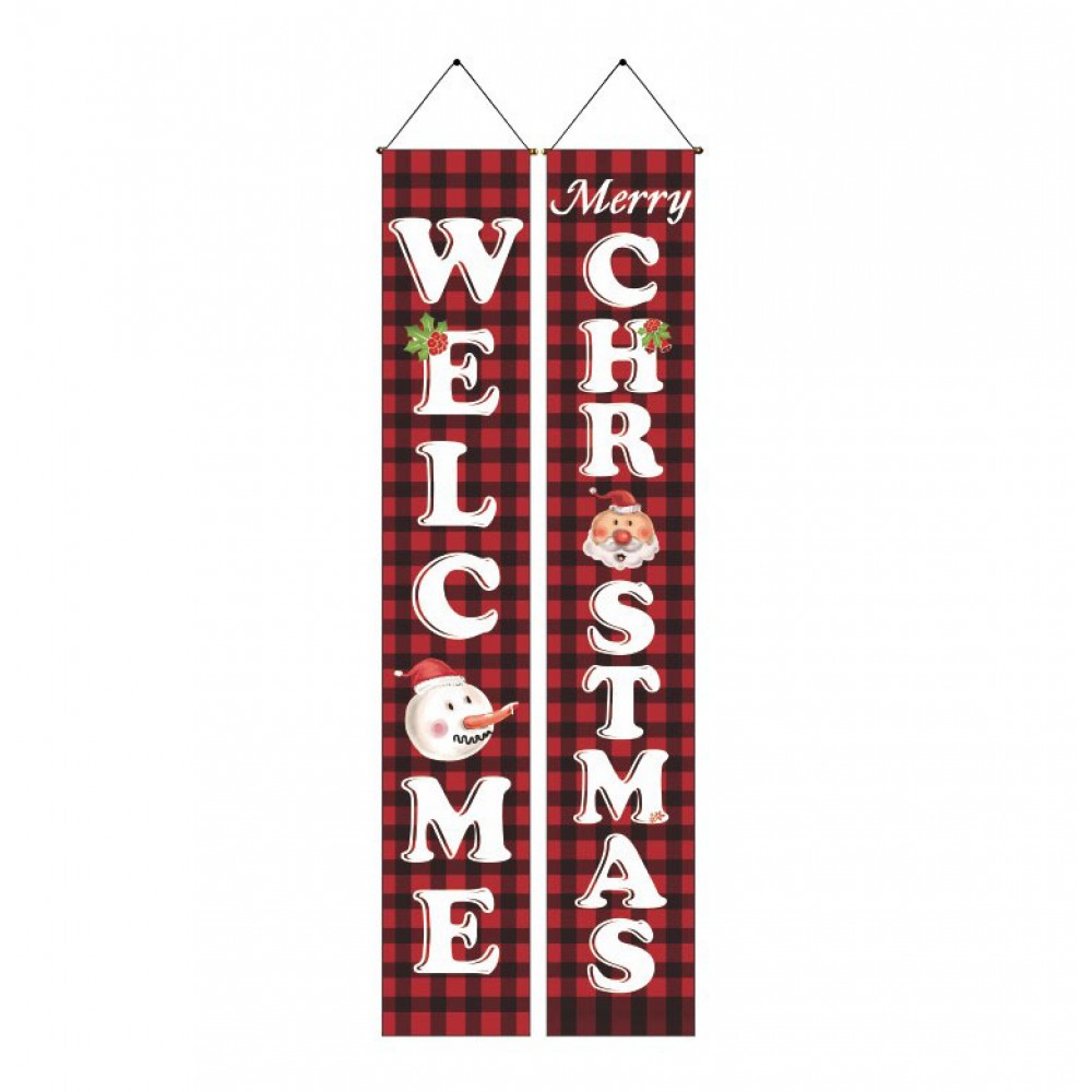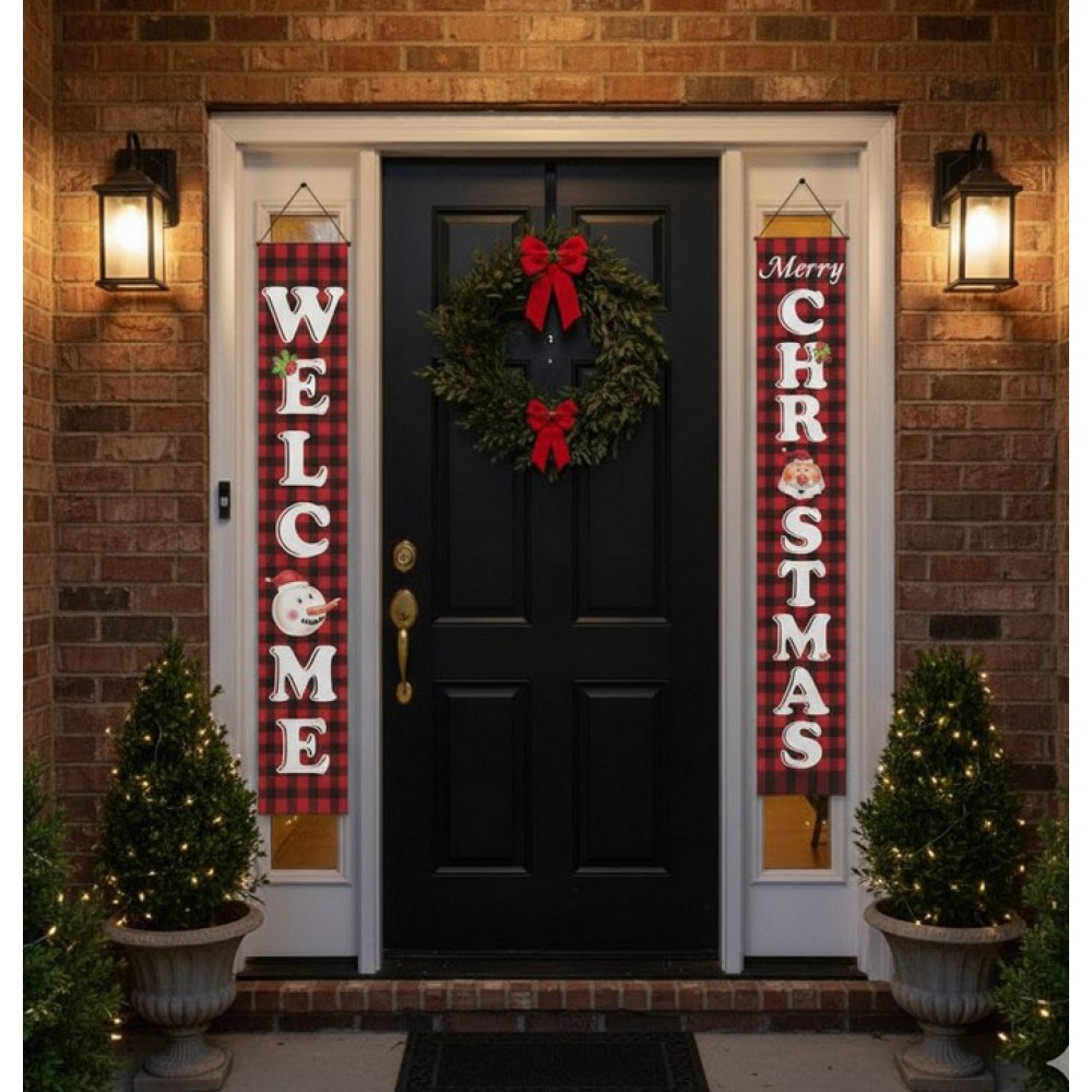 Набір вертикальних новорічних банерів для дверей/отвору з принтом «Welcome» і «Merry Christmas». Дизайн виконаний у червоній клітинці, на полотнах присутні святкові персонажі (на фото — сніговик і Санта). Формат — дві вузькі довгі панелі, які зручно використовувати як дверну прикрасу на Новий рік та Різдво: у квартирі, будинку, офісі, на святковій зоні або фотокутку.