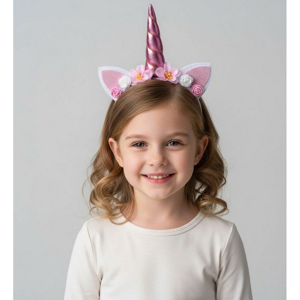 Дитячий обруч на голову в образі єдинорога виконаний у рожевій кольоровій гамі та підходить для святкових і костюмованих образів. Аксесуар прикрашений витим рожевим рогом, вушками з блискучою вставкою та декоративними елементами у вигляді квітів і трояндочок. Такий дизайн робить обруч помітним і добре читабельним в образі.