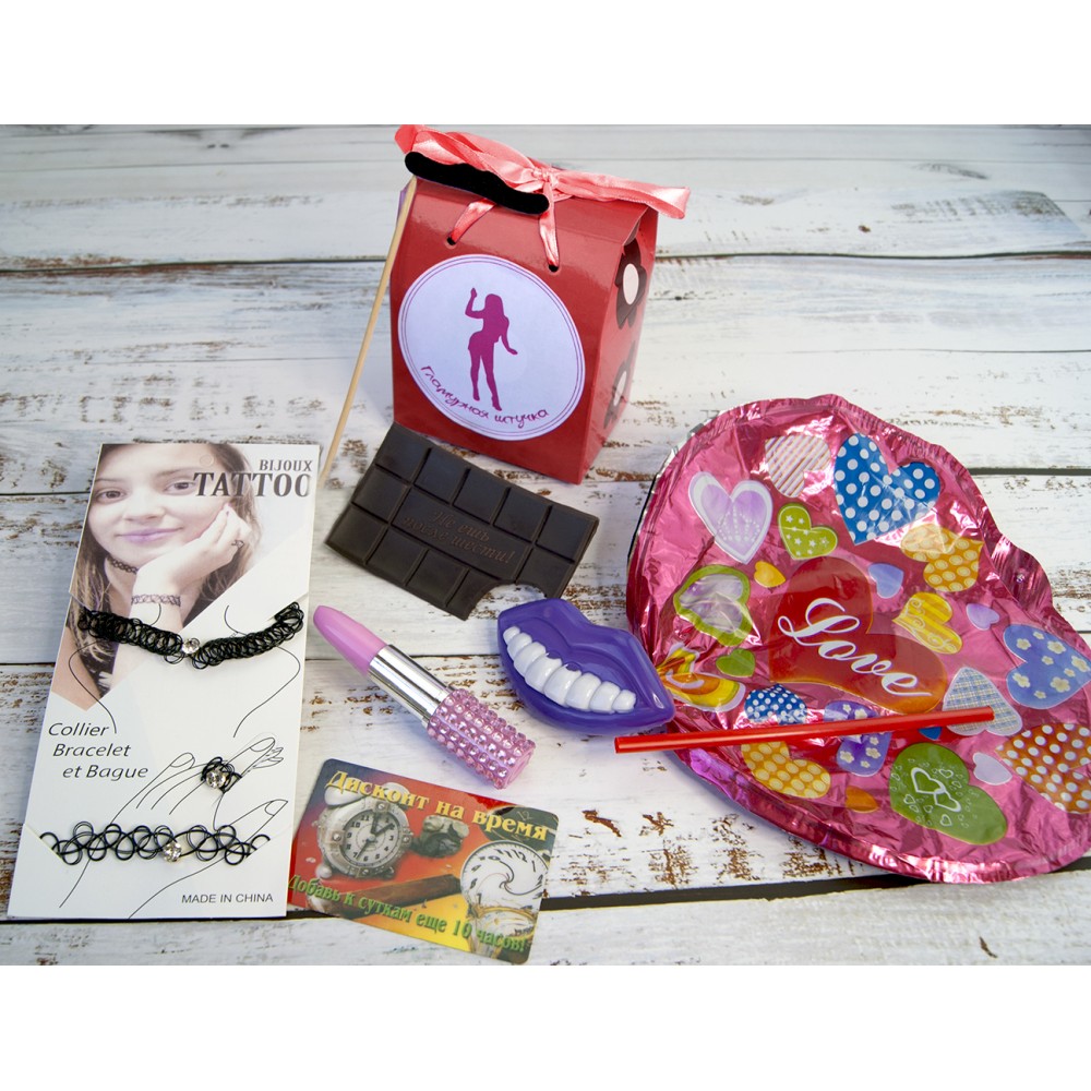 Яскравий Оригінальний подарунок Гламурна Штучка стане чудовою знахідкою у вигляді подарунка подружці. Діти люблять дарувати один одному всякі дрібнички, особливо коли є якийсь привід, як у звичайний день, без приводу, так і з нагоди дня народження чи іншої урочистості. Інтернет-магазин Карнавал Жартів пропонує купити незвичайний подарунок для шкільної подруги чи однокласниці. Також цей маленький презент можна подарувати однокласниці на День Народження. Такий дитячий набір складається з барвистої коробки з цікавими подарунками, які підкорять будь-яку дівчинку. Купивши Оригінальний подарунок Гламурна Штучка у нашому інтернет-магазині Ви отримуєте не лише якісний товар, а й 100% позитивних вражень від придбання. Серед нашого широкого асортименту товарів, Ви знайдете безліч незвичайних та оригінальних подарунків для різноманітних заходів. У набір входить: Тату чокер з стразами (кольє, браслет, кільце) - 1шт., ручка Помада з стразами (рожева) - 1шт., магніт Шоколадка - 1шт., прикольна карта Дисконт на час - 1шт., Кулька (45см) Серце з принтом - 1шт., Фотобутафорія Вуса - 1шт., Свисток Губи - 1шт. Колір комплектуючих може відрізнятися від кольору, вказаного на фотографії.