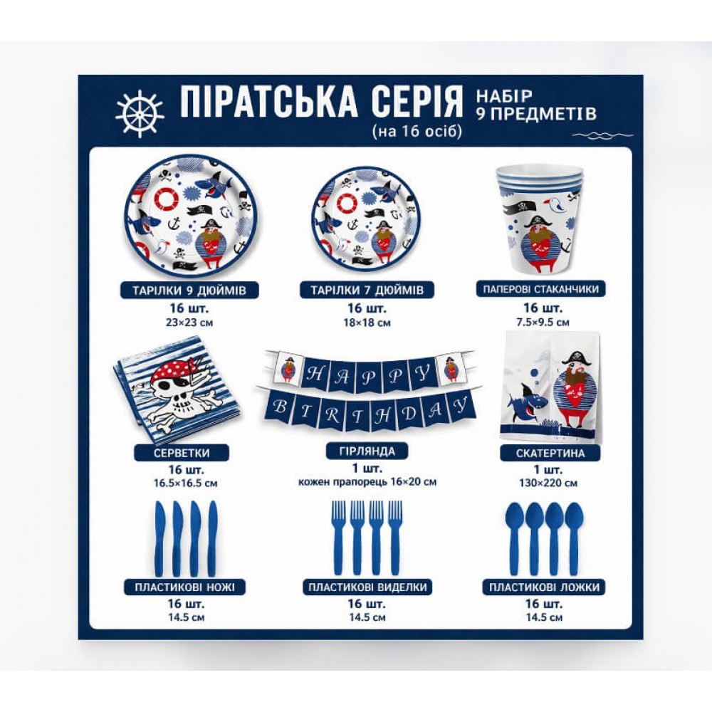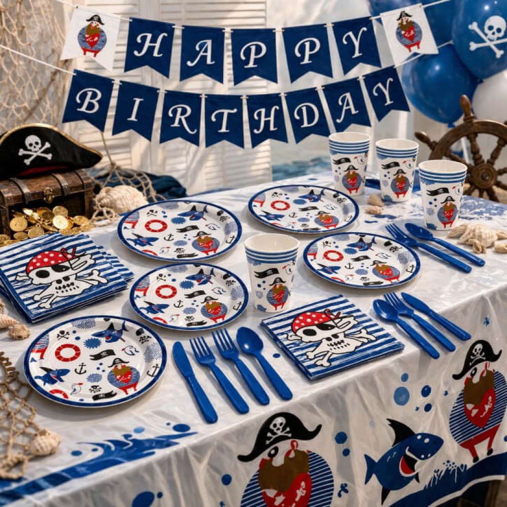 Яскравий дизайн з піратською тематикою відразу привертає увагу і чудово підходить для дитячих свят, днів народження та тематичних вечірок. Усі елементи поєднуються між собою, створюючи цілісний і акуратний зовнішній вигляд.
