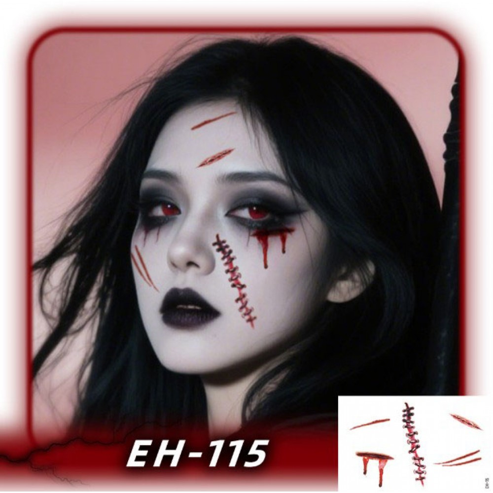 Якщо хочеш, щоб хелловінський макіяж виглядав по-справжньому страшно та ефектно — татуювання “Криваві шрами” (EH-115) допоможе створити ідеальний образ. Вона виглядає як свіжі порізи та зашиті шрами з крапельками крові, додаючи моторошний реалізм до макіяжу відьми, демона, зомбі чи вампіра.