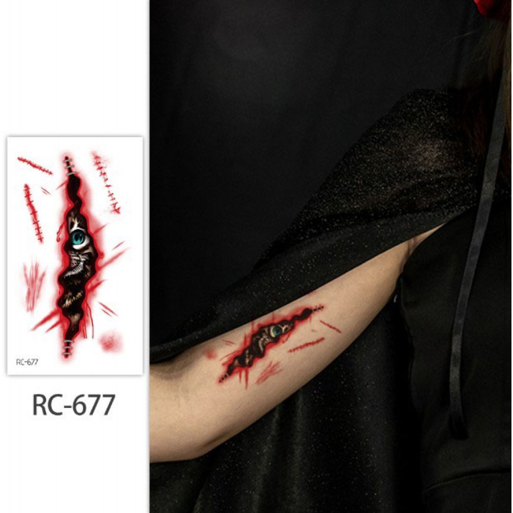 Хелловін — час, коли можна пограти з образом і перетворити звичайну шкіру на моторошний витвір мистецтва. Перекладна тату «Око в рані» (RC-677) виглядає так, ніби з-під розірваної шкіри спостерігає чиєсь зловісне око. Червоні шрами, порізи та тріщини створюють ефект реалістичного пошкодження, від якого неможливо відвести погляд.