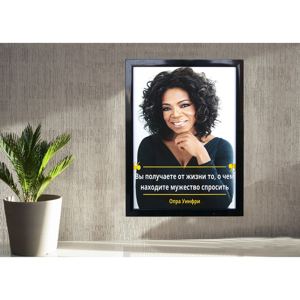 Постер мотиватор 56102 ВИ ОТРИМАЄТЕ ВІД ЖИТТЯ… А4 – розкриває серію постерів думки великих людей. Містить змістовну фразу успішної американської медіа леді Опри Гейл Уїнфрі Ви отримуєте від життя те, про що знаходите мужність запитати промовлену в 2013, є актуальною і донині. Вона мала на увазі, що в житті краще змінюватися, ніж стояти. Якщо Ви завжди робите те, що завжди робите, Ви завжди отримуєте те, що завжди отримували. А спробуйте робити щось інше, щоб отримати в результаті щось інше. Постер можна повісити на стіну або іншу поверхню, поставити стіл. Мотивуючий постер надрукований на матовому фотопапері та вставляється у легку рамку з склом, задником та кріпленнями на стіну. Оптовий інтернет магазин Подарок-ТУТ пропонує купити цікаві та оригінальні подарунки за доступними цінами. Ваш подарунок надихатиме свого нового власника ще дуже довго, даруючи посмішку кожен день!