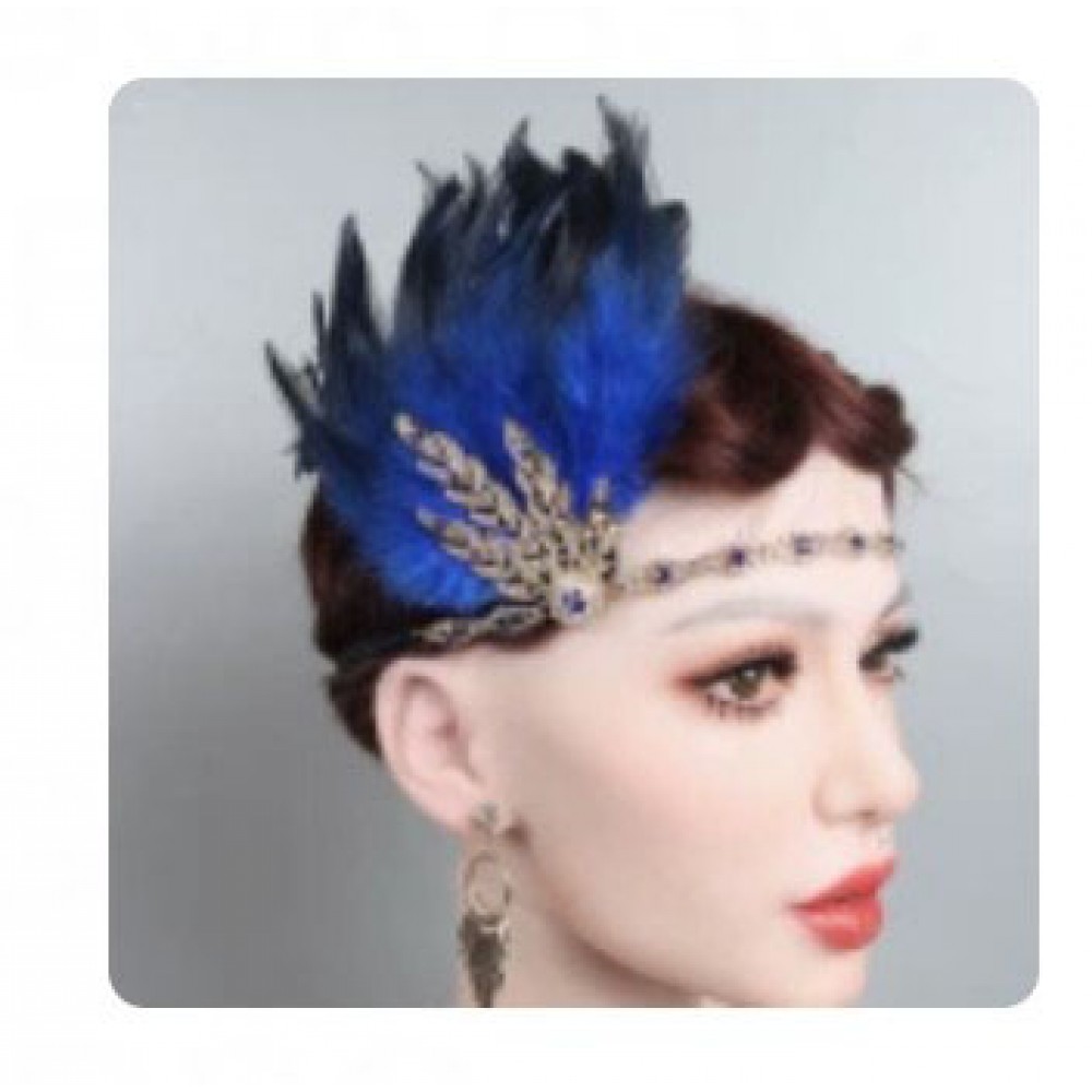 Пов'язка Гетсбі «Синій джаз» відразу переносить в епоху підпільних клубів, контрабандного віскі та шалених танців чарльстон. Яскраві сині пір'я з чорним кінчиком утворюють високий, повітряний віяло збоку голови, а прикрашена кристалами основа красиво обіймає лоб і мерехтить при кожному русі. Такий аксесуар миттєво перетворює звичайну сукню в костюм справжньої flapper-girl і виглядає ефектно і вживу, і на фото.
