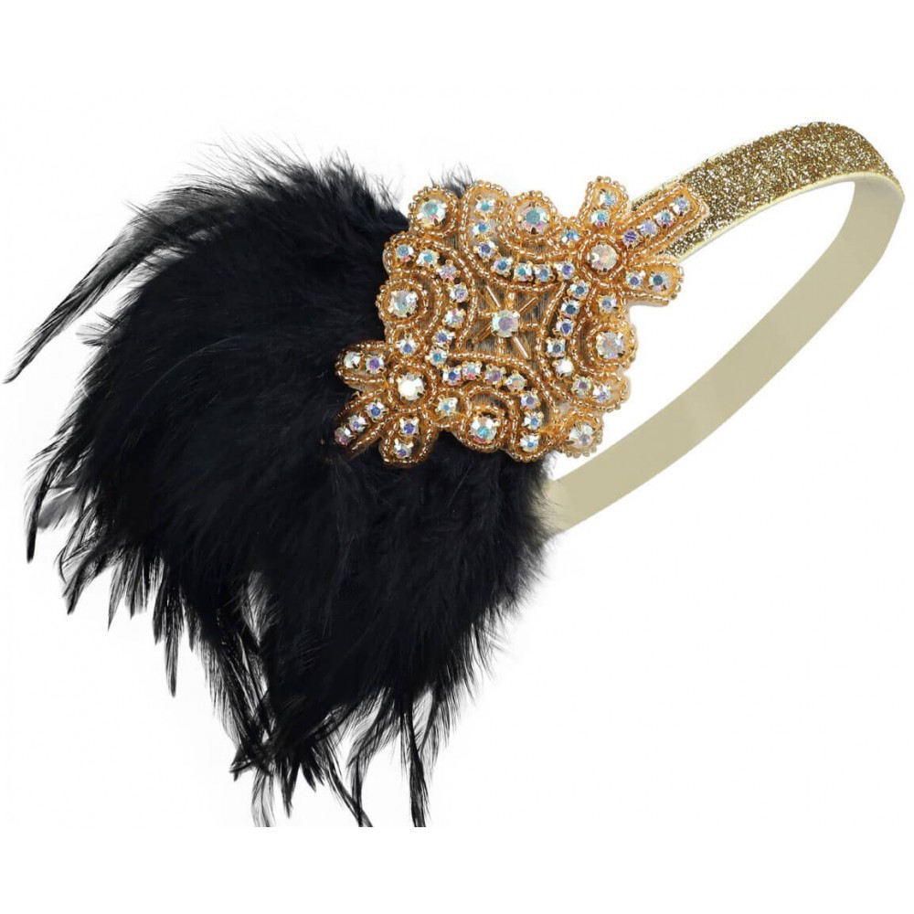 Золотий декор з кристалами і бісером сяє при будь-якому освітленні — від м'якого ресторанного світла до яскравих спалахів фотокамери. Глибокі чорні пір'я додають драматичності і роблять аксесуар по-справжньому театральним. Такий контраст золота і чорного — класика 1920-х, яка ніколи не виходить з моди.