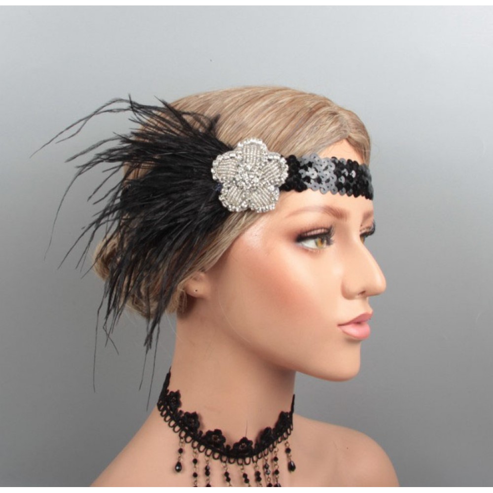 Ця пов'язка — як привіт з двадцятих, де панували музика, свобода і зухвала жіночність. Чорні пір'я м'яко коливаються, створюючи атмосферу таємничості, а блискуча обробка і брошка у вигляді квітки додають розкоші та витонченості.