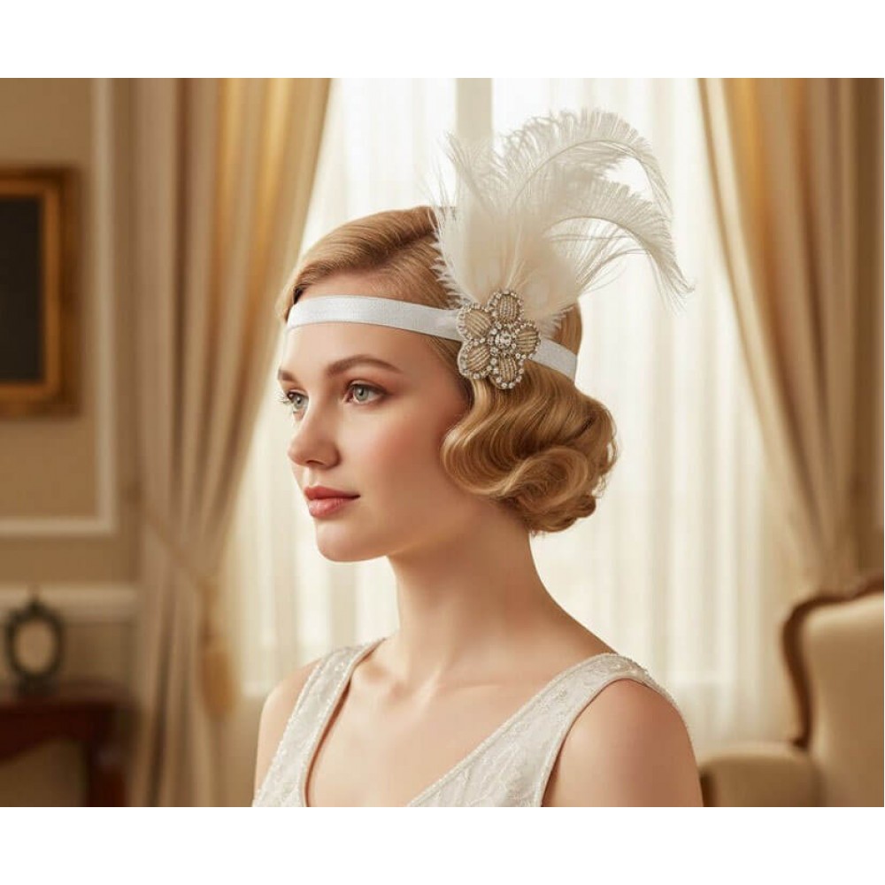 Повязка «Белая Орхидея» в стиле Гэтсби — изысканный женский аксессуар для создания нежного и роскошного образа в духе 1920-х годов. Белое страусиное перо в сочетании с блестящим декоративным элементом со стразами выглядит утончённо, празднично и очень фотогенично. Такой аксессуар идеально подходит для вечеринок в стиле Гэтсби, свадебных фотосессий, девичников и тематических мероприятий.