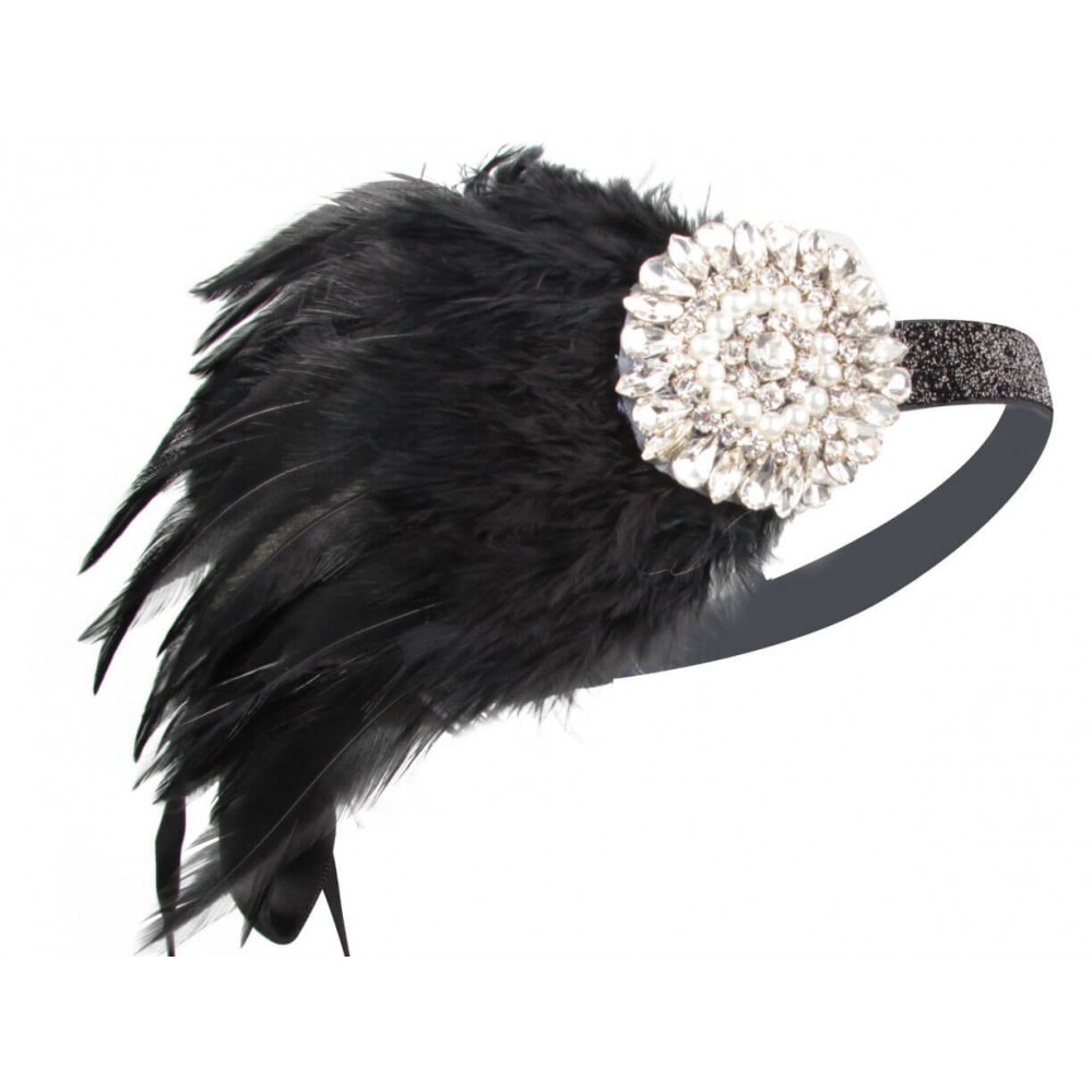 Повязка «Чёрный Бриллиант» в стиле Гэтсби женская с чёрным страусиным пером и брошью со стразами 1920-е
