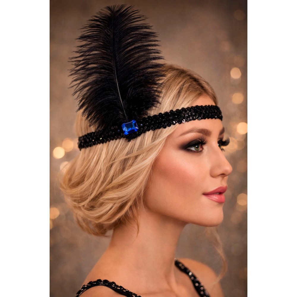 Черное перо придает образу глубину и драматичность, а блестящие стразы и декоративный камень делают аксессуар заметным даже при приглушенном свете вечеринки или сцены. Такая повязка на голову в стиле Гэтсби отлично смотрится с платьем 20-х годов, вечерним платьем, костюмом в стиле Чикаго или даже современным нарядом, если хочется добавить ретро-нотку. Аксессуар легко фиксируется на голове и подходит большинству девушек благодаря эластичной основе.