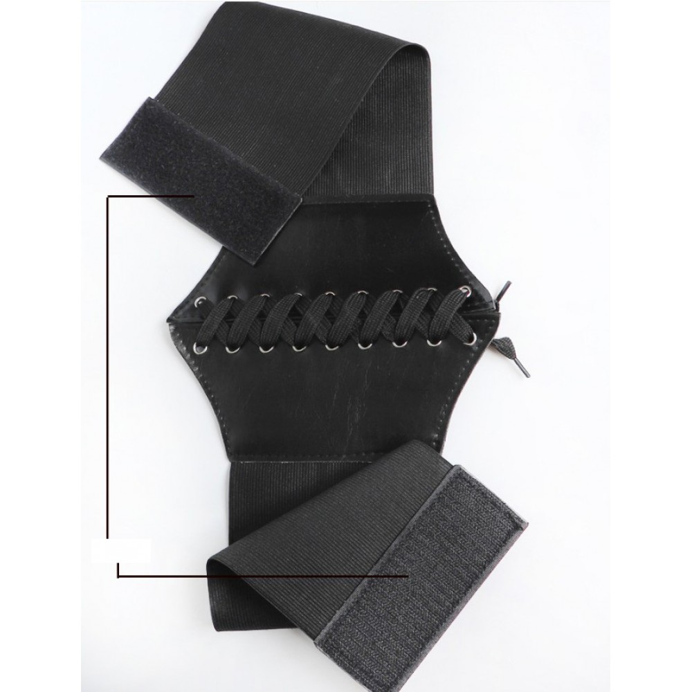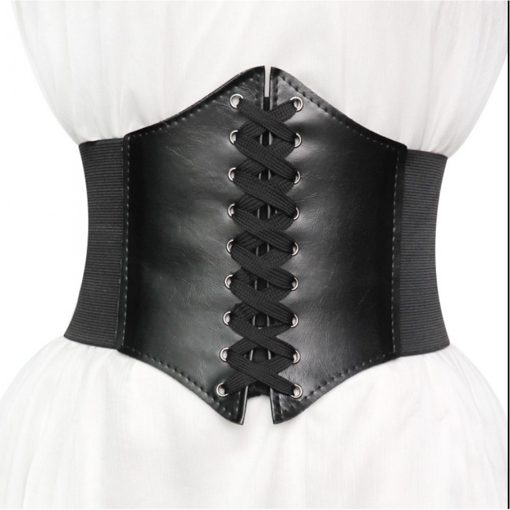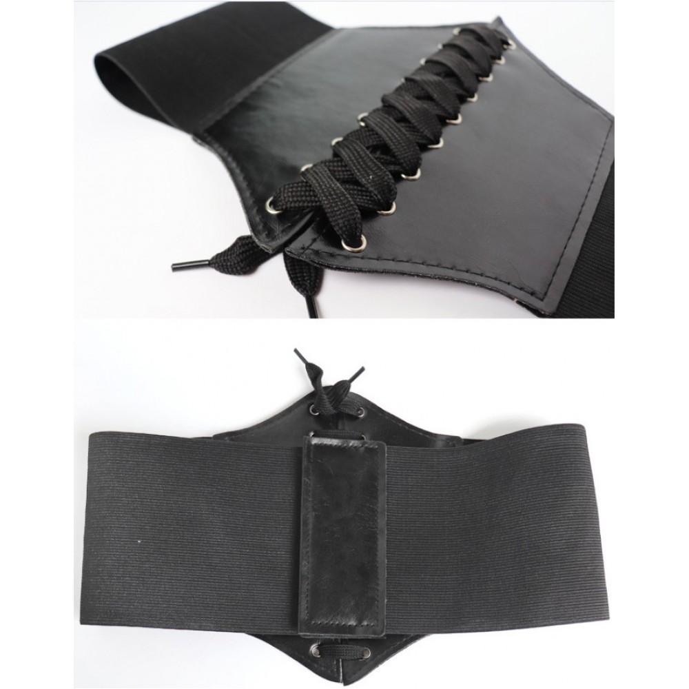 Чорний широкий пояс з шнурівкою — класика, яка робить талію візуально вужчою і додає образу виразності. Виглядає стильно як у повсякденних, так і в тематичних луках.