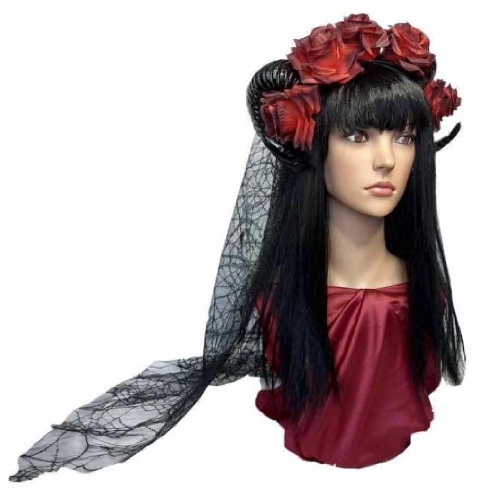 Коліркрасный с черным, Рог коричневыйМатеріалискусственные цветы, гипюр, пластикРозмір виробу27х23х14см, Размер Рога 38х5см, Длина фаты 85смКраїна виробникУкраинаУсі характеристики