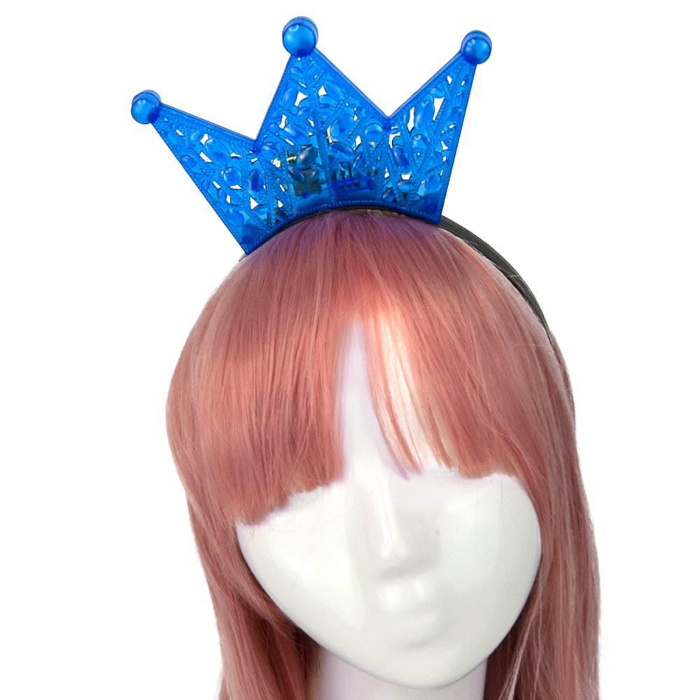 Аксессуар на обруче Корона светящаяся (синий) из названия понятно, что изделие не только эффектное по дизайну, но и по функционалу. Светящаяся корна на ободке не оставят равнодушным ее обладателя. Корона работает от батареек. Включение и выключение происходи при помощи кнопки на задней части аксессуара. Перед включением необходимо извлечь пластиковую заглушку, блокиратор включения и сместить кнопку вверх. Такой аксессуар станет отличным дополнением к веселому образу, который порадует, и детей, и взрослых. И не оставит обладателя такого оригинального обруча с глазами незамеченным даже в темноте.