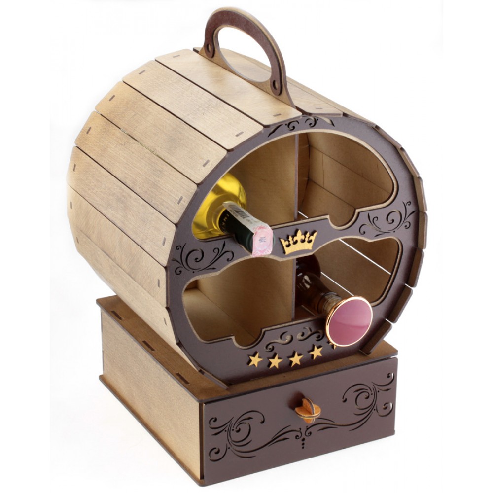 Презентабельный оригинальный мини бар. Дизайн бара выполнен в виде бочки - подставки для четырех бутылок. Ячейки для бутылок имеют размер 24*9*8 см, что позволяет хранить самые популярные размеры как винных бутылок, так и крепкого алкоголя. Сверху бара расположена удобная ручка для переноски. В нижнем резном ящике имеются 6 ячеек для рюмок (рюмки не в комплекте). Туда также можно положить различные аксессуары и штопор. В комплекте бара 4 подставки для рюмок и бокалов.Мини бар будет отличным и солидным подарком. А также как стильный элемент интерьера
