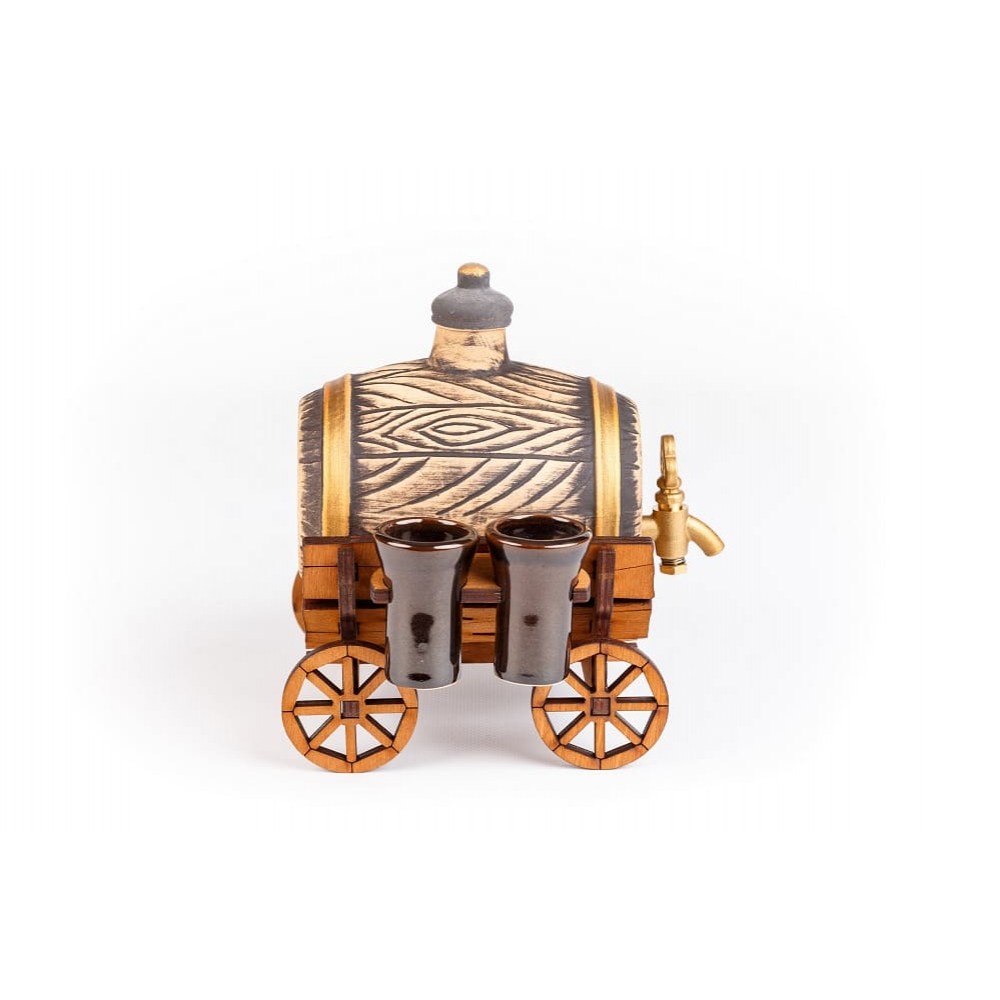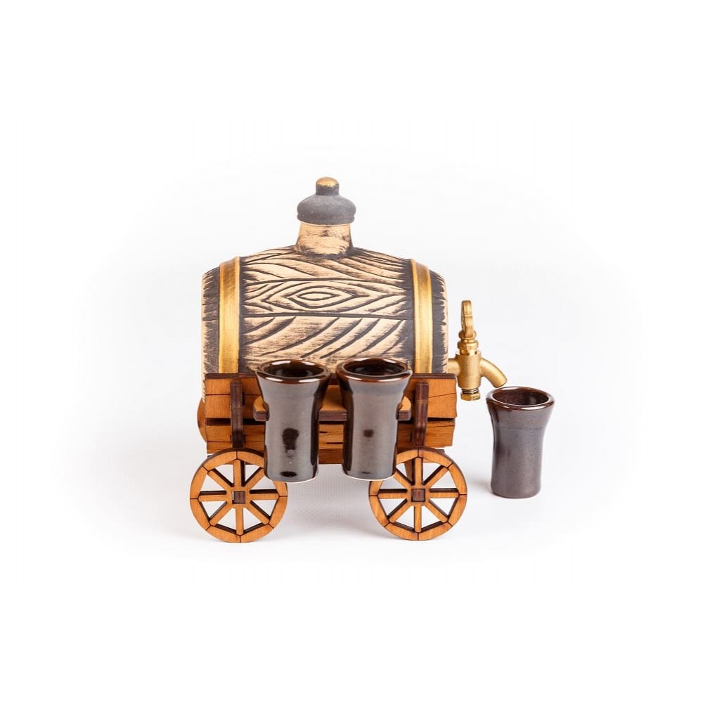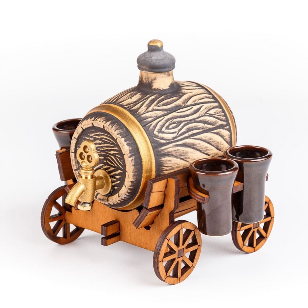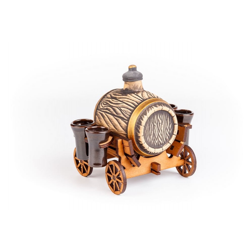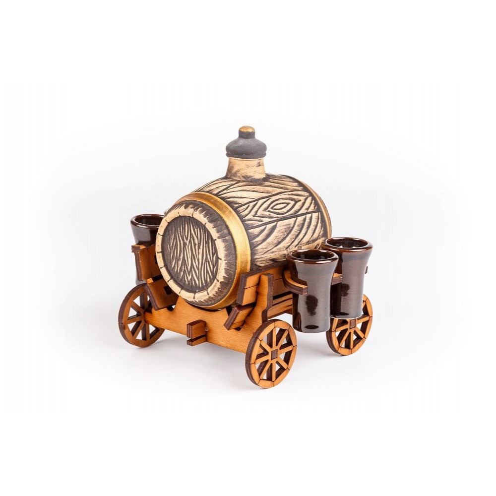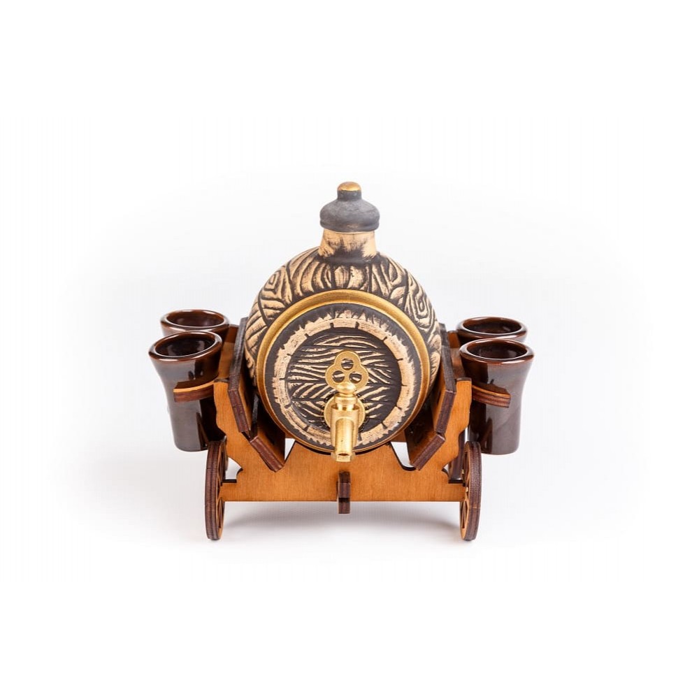 Небольшая керамическая бочка на деревянной фире с 4 рюмками будет смотреться роскошно на подаче домашнего вина или водки.