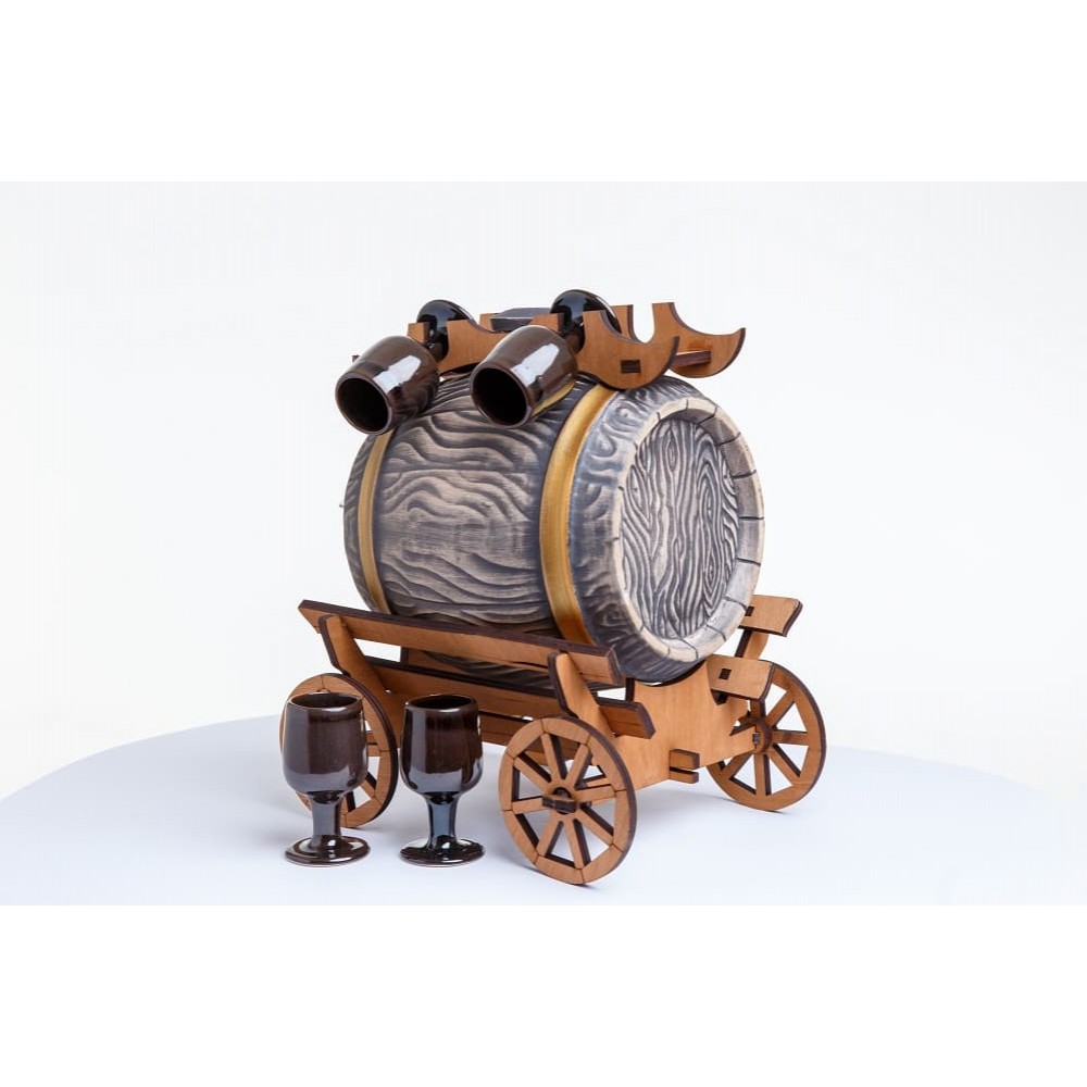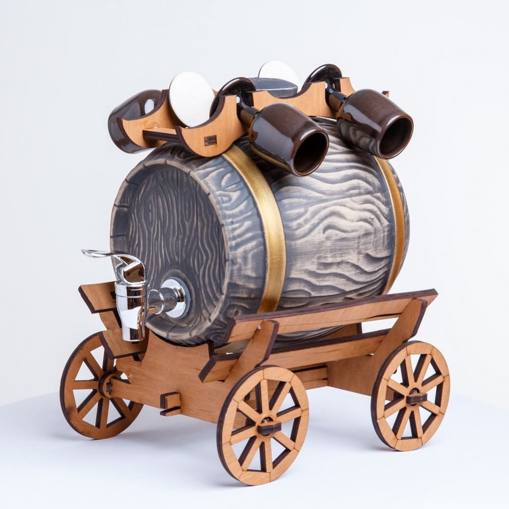 Прекрасное исполнение мини-бара из керамической бочки на 3 литра с 4 бокалами. Бочка дополнена изысканным краником, что облегчит разлив напитка и дизайнерскими рюмками.