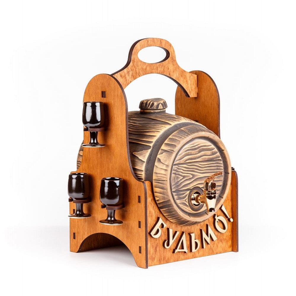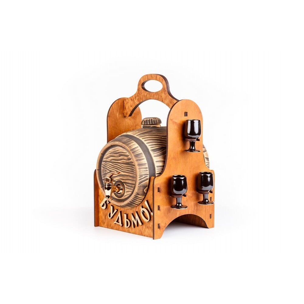 Мобильный мини-бар "Будем!", который своим присутствием оживит любое застолье. Набор состоит из керамической бочки, деревянного корпуса с ручкой и изящных черных рюмок, которым предусмотрено место в дизайне мини-бара. Купите себе или извините близких.