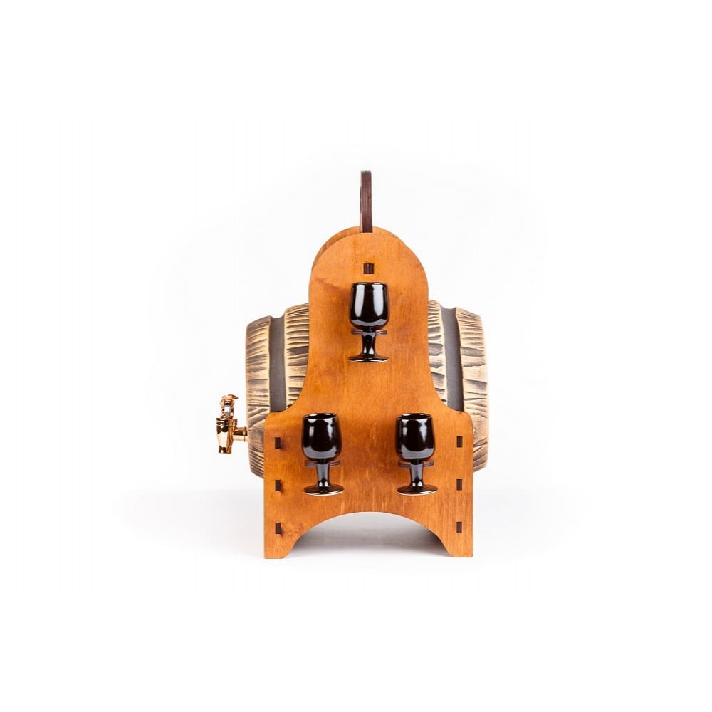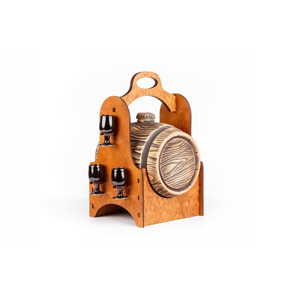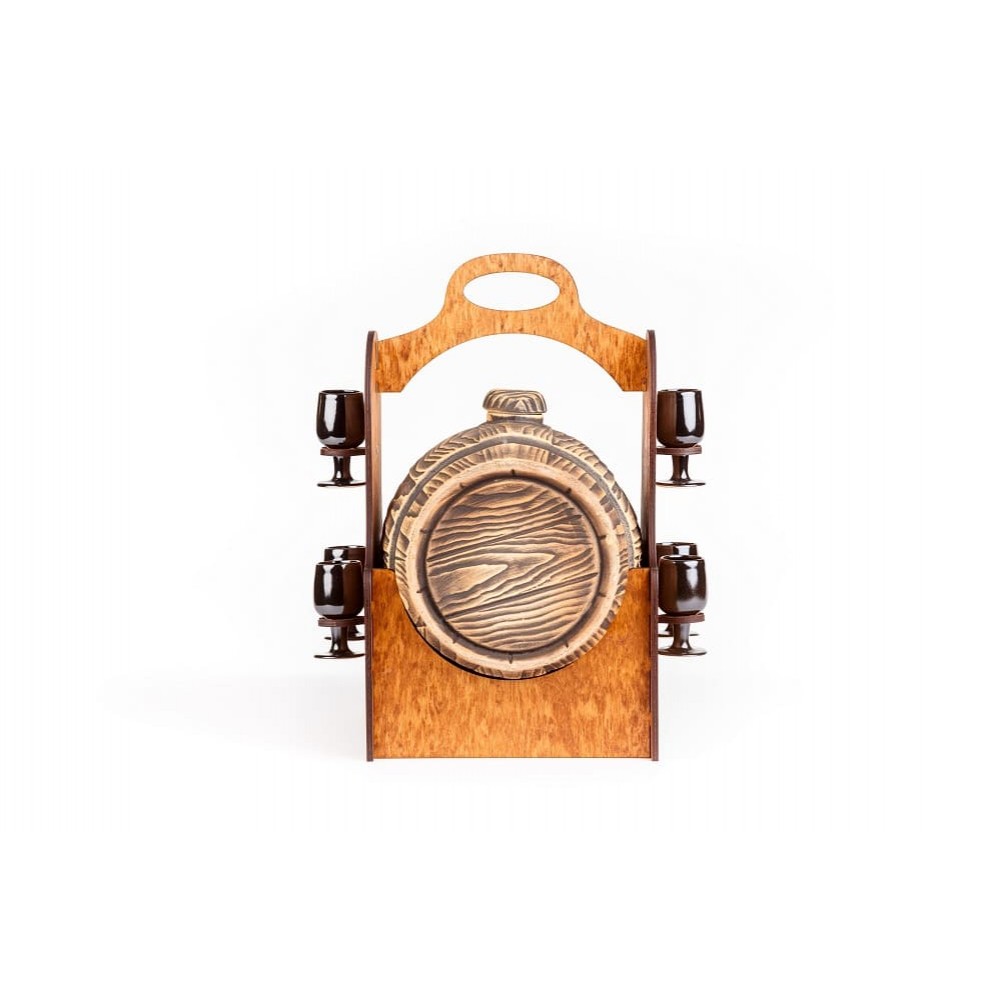 В комплект входит: подставка, бочка, 6 рюмок