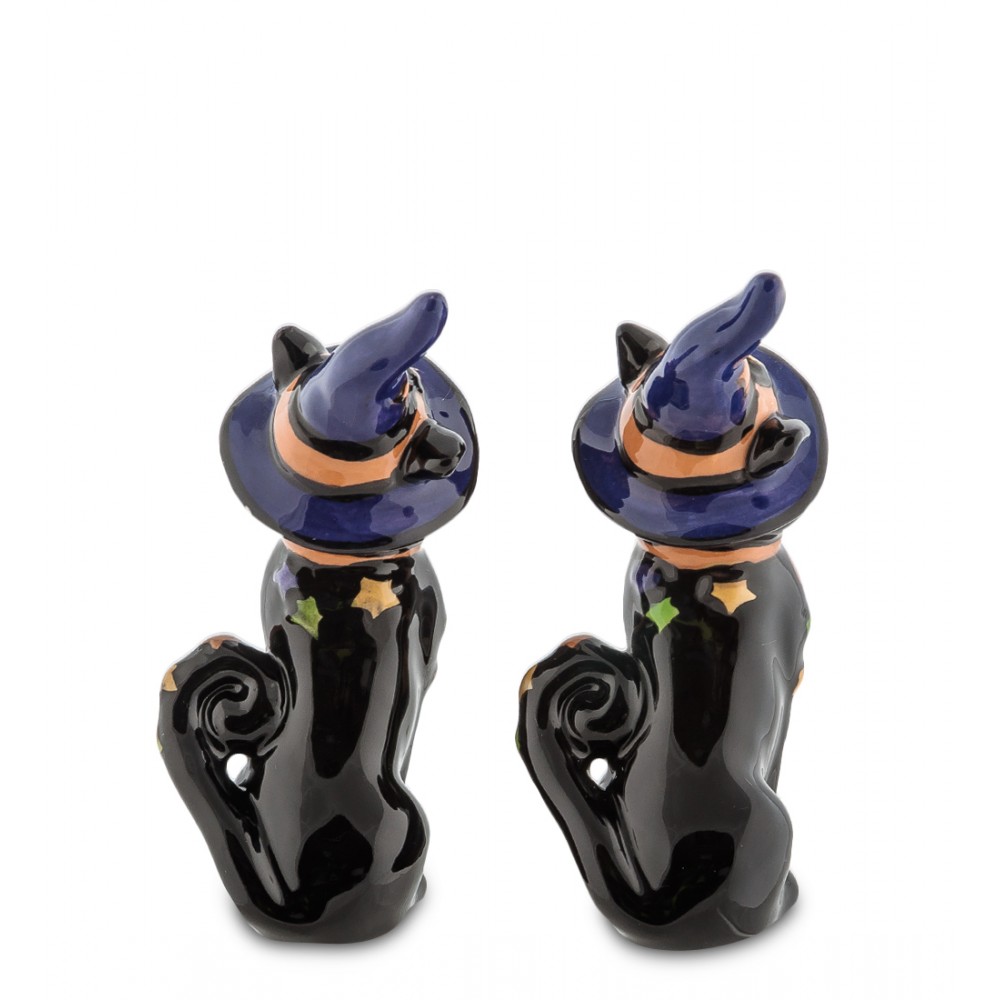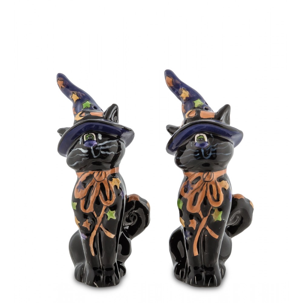Набор соль-перец ''Волшебный кот'' высотой 15 см. ; Черная кошка считается вторым по значению символом Хэллоуина после тыквы, с ней связано огромное количество предрассудков и несчастливых примет. Однако вопреки поверьям в эти дни кошкам черного окраса воздают особенные почести. Считается, что черная кошка - это самый прекрасный помощник мага и спутник человека. А черный цвет может великолепно оберегать от скверных воздействий, поглощая негативную энергию. Черная кошка не привлекает, а, наоборот, отводит все плохое от человека и дома, в котором он живет и лучше всех справится с ролью защитника.
