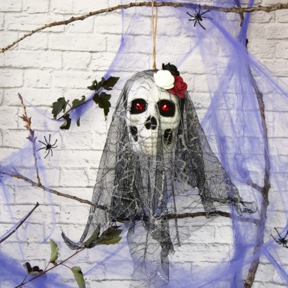 Череп готический Амиона черный с белым №10052 - украшение на Хэллоуин из серии подвесного декора с петелькой для подвешивания на вечеринку в стиле Santa Muerte или Хэллоуин. Череп готический с фатой изготовлен из качественного Матеріала, который не рассыпается, пенополистирола, фата - гипюр. Особого шарма готическому черепу придают три розочки из фоамирана. А красные кристаллы в глазах эффектно переливаются и создают впечатление горящих глаз при попадании света. Идеально подходит для украшения арт-пространства клуба, фото зоны на Хэллоуин. Просто повесьте на дверь или стену, чтобы удивить ваших гостей во время праздника Дня всех мертвых. Также декор можно поставить на край стола, барной стойки и фата будет красиво свисать. Рекомендуем к этому подвесному черепу готическому еще паутину которая поможет Вам воссоздать мистическую атмосферу.Интернет-магазин Подарок-ТУТ! предлагает купить висячие украшения для дома с привидениями по лучшим ценам в Украине.