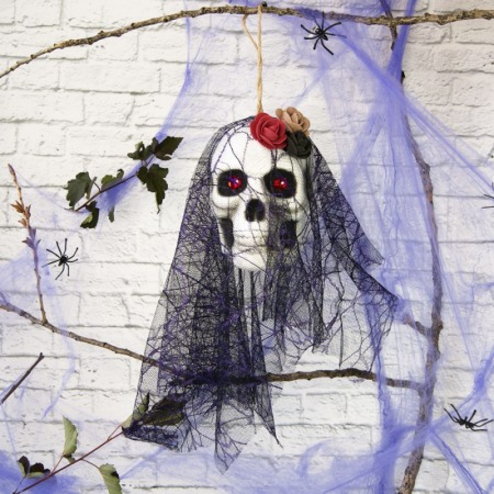 Череп готический Амиона черный с фиолетовым №10054 - украшение на Хэллоуин из серии подвесного декора с петелькой для подвешивания на вечеринку в стиле Santa Muerte или Хэллоуин. Череп готический с фатой изготовлен из качественного Матеріала, который не рассыпается, пенополистирола, фата - гипюр. Особого шарма готическому черепу придают три розочки из фоамирана. А красные кристаллы в глазах эффектно переливаются и создают впечатление горящих глаз при попадании света. Идеально подходит для украшения арт-пространства клуба, фото зоны на Хэллоуин. Просто повесьте на дверь или стену, чтобы удивить ваших гостей во время праздника Дня всех мертвых. Также декор можно поставить на край стола, барной стойки и фата будет красиво свисать. Рекомендуем к этому подвесному черепу готическому еще паутину которая поможет Вам воссоздать мистическую атмосферу. Интернет-магазин Подарок-тут! предлагает купить висячие украшения для дома с привидениями по лучшим ценам в Украине.