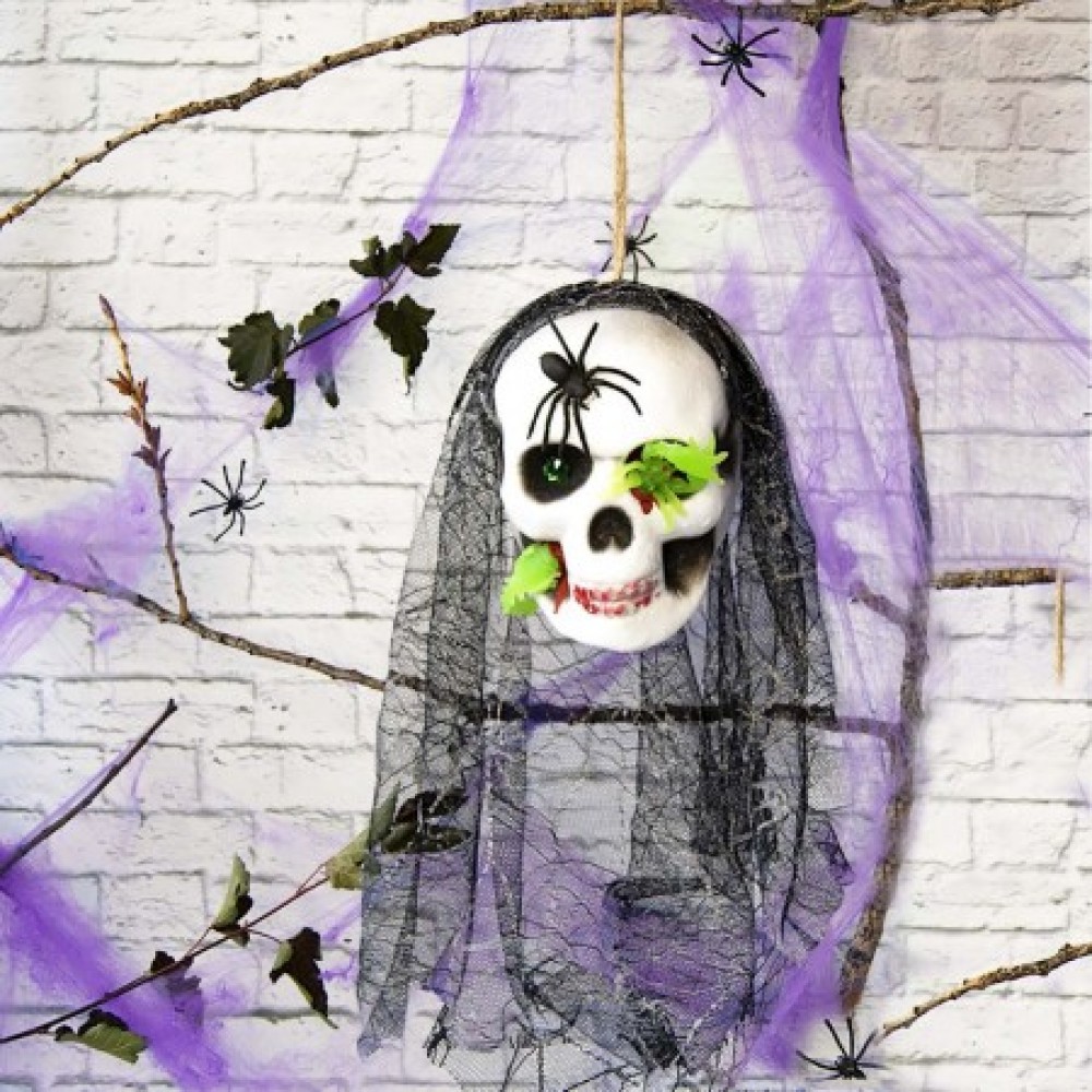 Череп готический Астарта черный с белым №10047 - украшение на Хэллоуин из серии подвесного декора с петелькой для подвешивания на вечеринку в стиле Santa Muerte или Хэллоуин. Череп готический с фатой изготовлен из качественного Матеріала, который не рассыпается, пенополистирола, фата - гипюр. Особого шарма готическому черепу придает проходящий светоотражающий скорпион сквозь череп через скулу и глазницу. А зеленыйкристалл в глазе эффектно переливается и создает впечатление горящего глазп при попадании света. Идеально подходит для украшения арт-пространства клуба, фото зоны на Хэллоуин. Просто повесьте на дверь или стену, чтобы удивить ваших гостей во время праздника Дня всех мертвых. Также декор можно поставить на край стола, барной стойки и фата будет красиво свисать. Рекомендуем к этому подвесному черепу готическому еще паутину и череп светильник, которые помогут Вам воссоздать мистическую атмосферу. Интернет-магазин Подарок-ТУТ! предлагает купить висячие украшения для дома с привидениями по лучшим ценам в Украине.