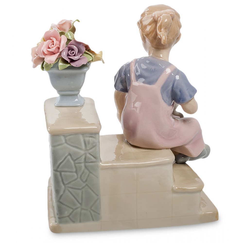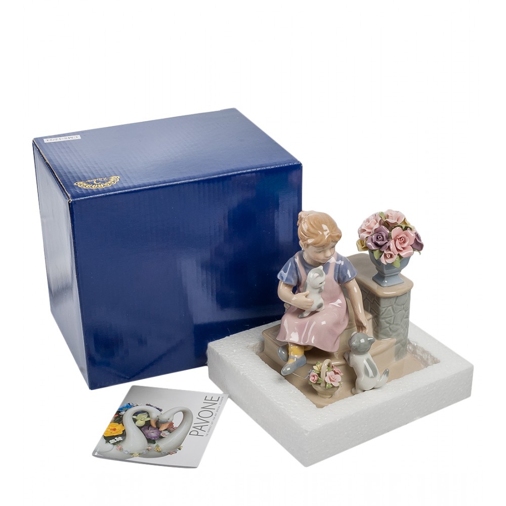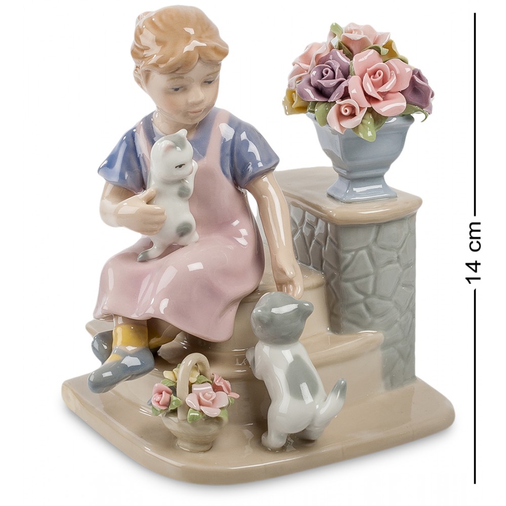 Статуэтка "Девочка с котятами" (Pavone) ; В этом доме явно любят красоту. Иначе зачем бы лестницу украшали роскошные цветочные композиции – большая на парапете, поменьше – на нижней ступеньке. И среди этой красоты присела на ступеньку маленькая девочка, чтобы поиграть с двумя маленькими котятами. А им только дай волю!