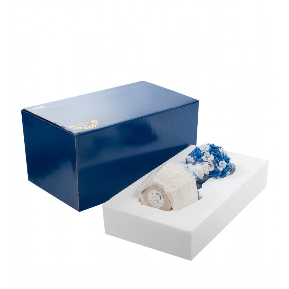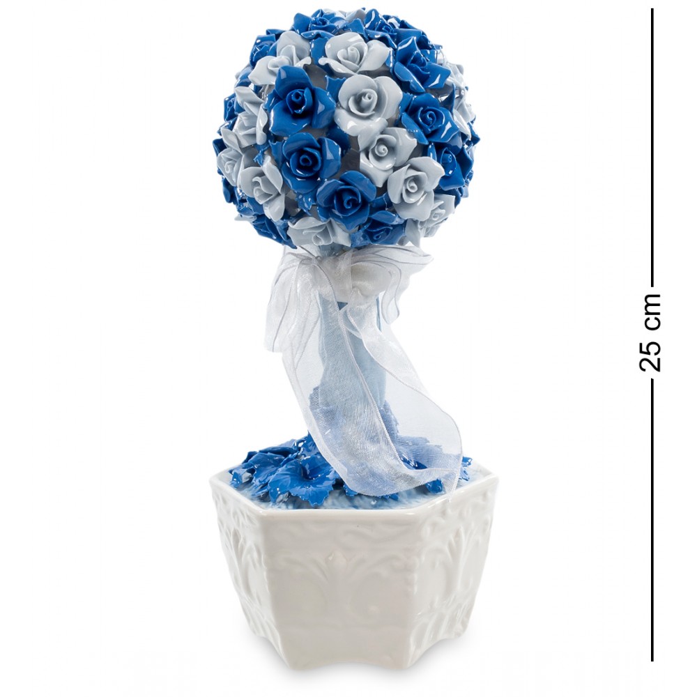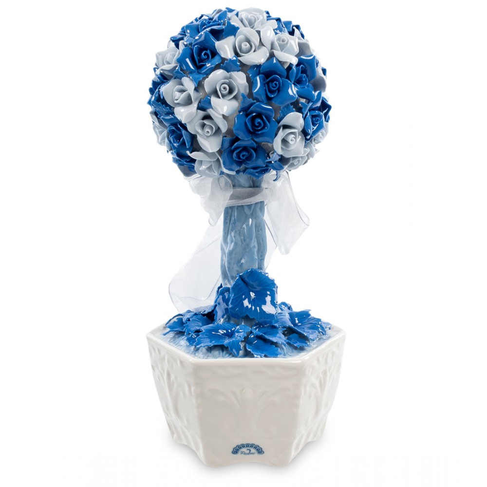 Изделие выполнено из фарфора в виде своеобразного топиария, который состоит из нежных бутонов роз. В декоре композиции используется белоснежный бант из легкой органзы, рельефные узоры и миниатюрные цветочные фигурки. Фарфоровый букет оформлен тремя оттенками – синим, серым и белым, которые удачно сочетаются друг с другом, делая композицию еще более изысканной и утонченной.;