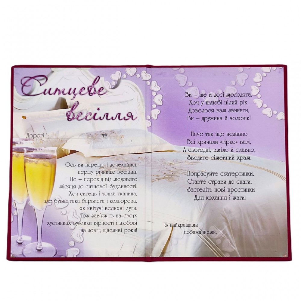Диплом "1 год Ситцевая свадьба" (русскоязычный) Поздравить своих родных или друзей таким дипломом можно на годовщину свадьбы. В дипломе есть строки стихи для молодых и лучшие пожелания! Подписываете для кого дарится диплом, можно положить несколько купюр и диплом служит вместо банальной открытки. Имеет вид книжки. Переплет может быть в другом цвете.