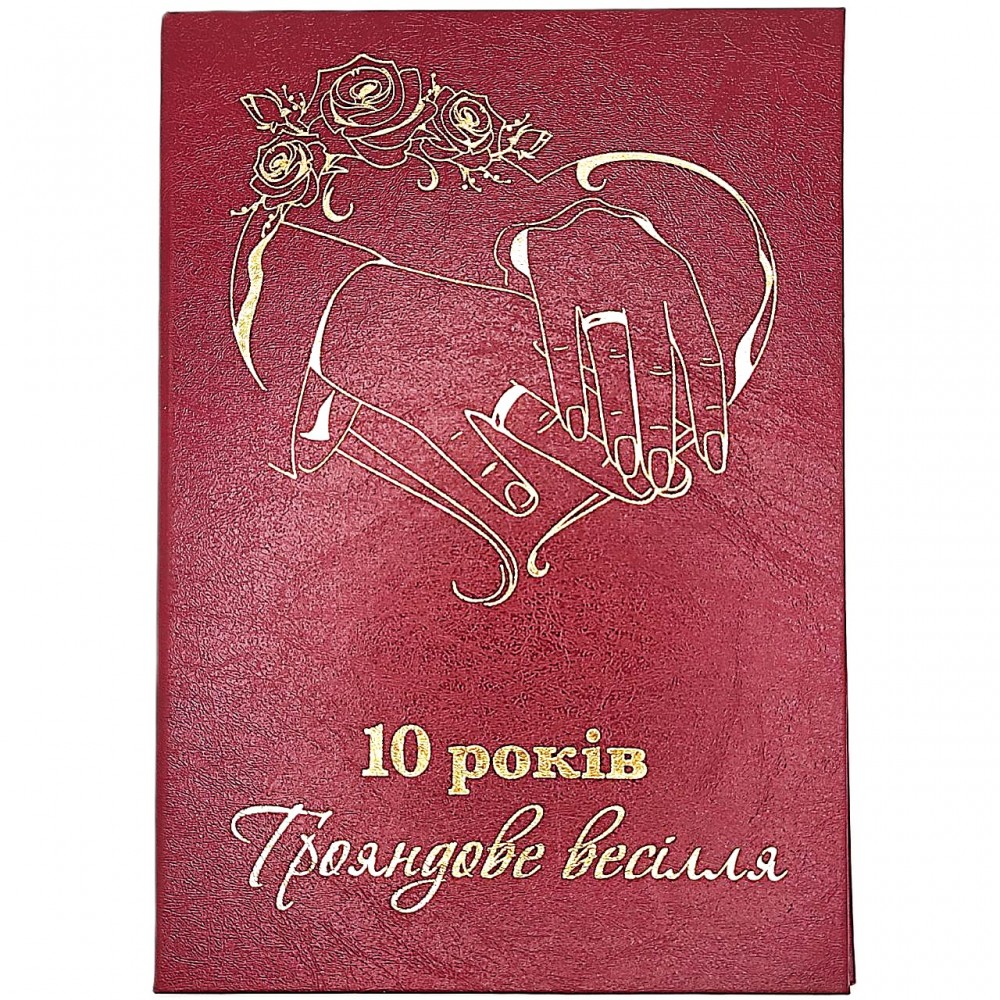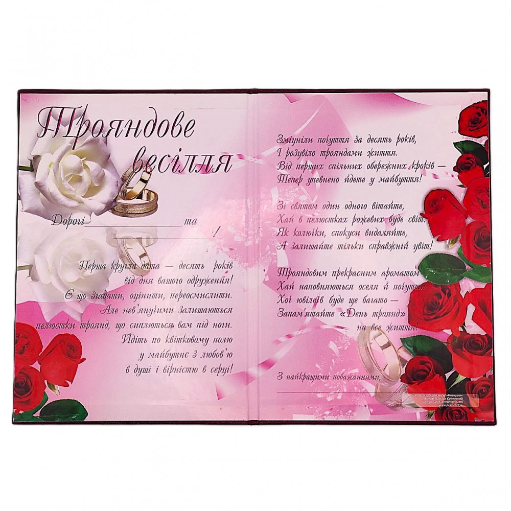 Описание Диплом "10 років Трояндове весілля" Поздравить своих родных с юбилеем свадьбы "10 років Трояндове весілля" можно таким дипломом и подарками в розовом цвете! Обложка может быть в другом цвете.
